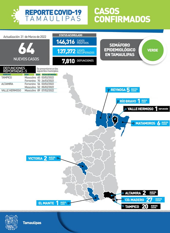 En su reporte diario, la Secretaría de Salud del Estado confirmó 64 nuevos casos y 5 fallecimientos asociados a complicaciones graves por el virus, por lo que insistió en la importancia de reforzar medidas de seguridad sanitaria en las áreas cerradas, centros de trabajo, aulas, tiendas departamentales y otras, donde deberá utilizarse el cubrebocas de forma generalizada.