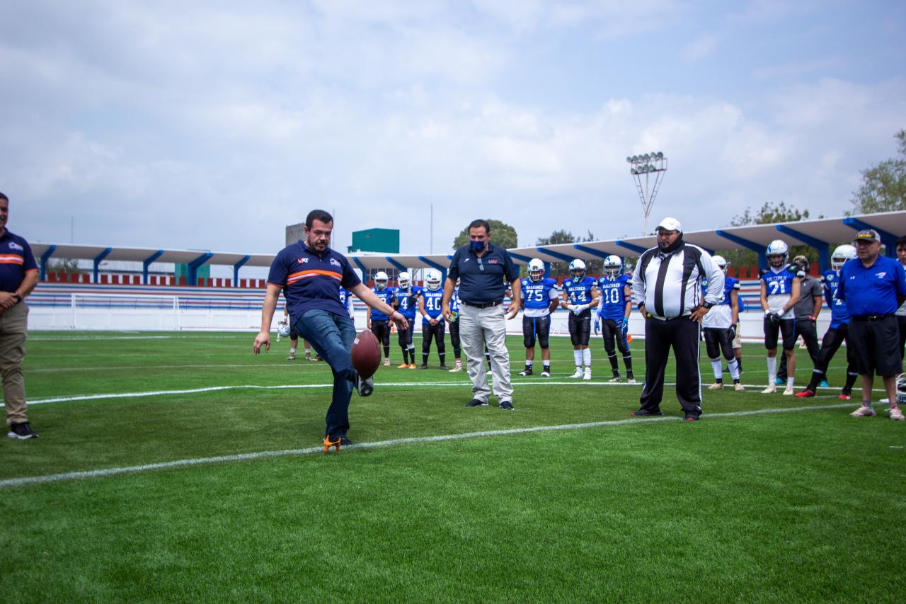 El Rector Mendoza Cavazos dio la patada inicial del encuentro entre los Correcaminos de la UAT y los Halcones de la Universidad Veracruzana, en la jornada tres de la ONEFA.