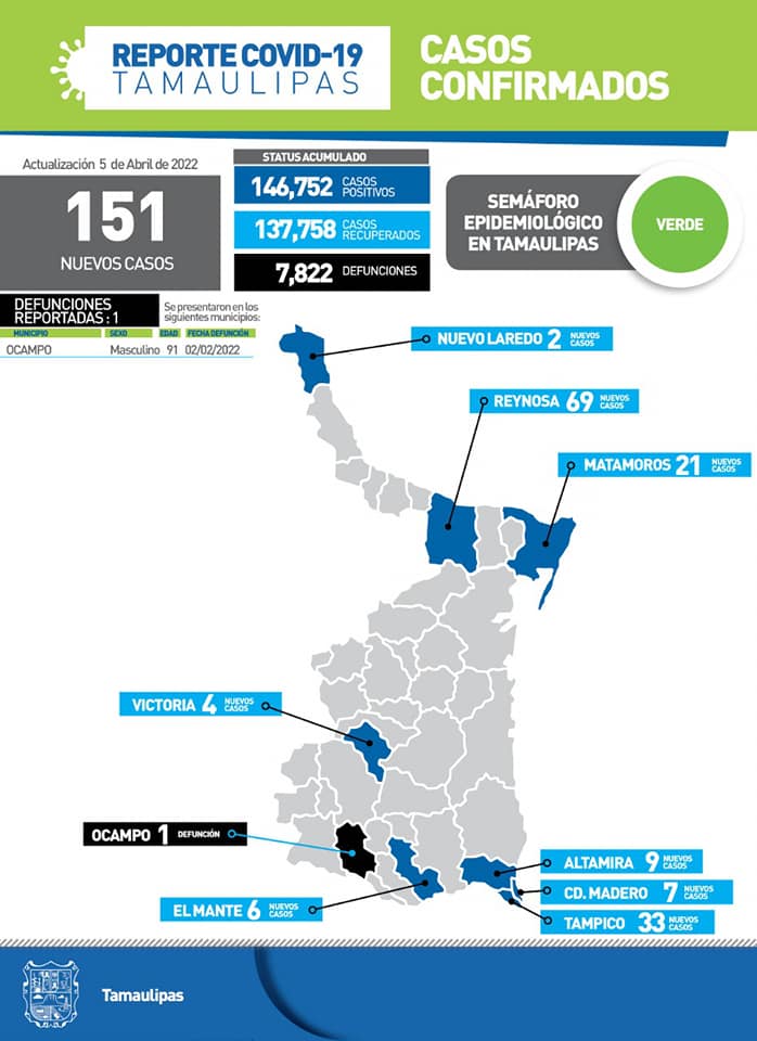 Tamaulipas cerró la jornada de este martes con un fallecimiento por COVID-19 y 151 nuevos casos, señaló la Secretaría de Salud del Estado en su reporte técnico diario, destacando la cifra más baja de defunciones tras superar la cuarta ola de contagios.