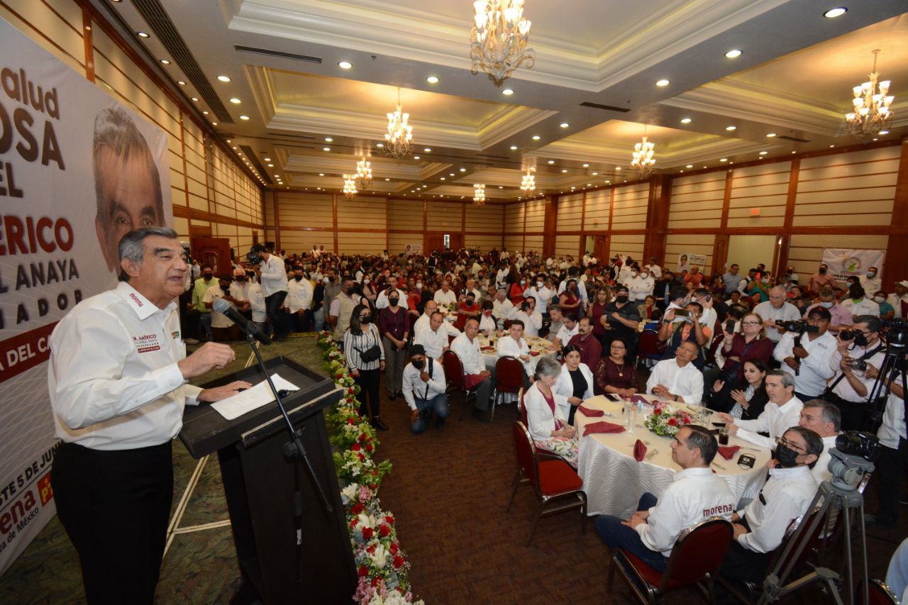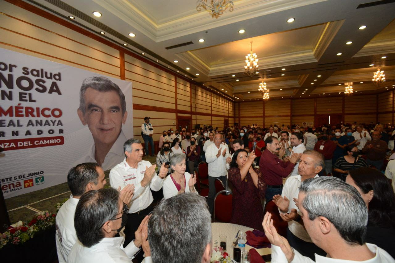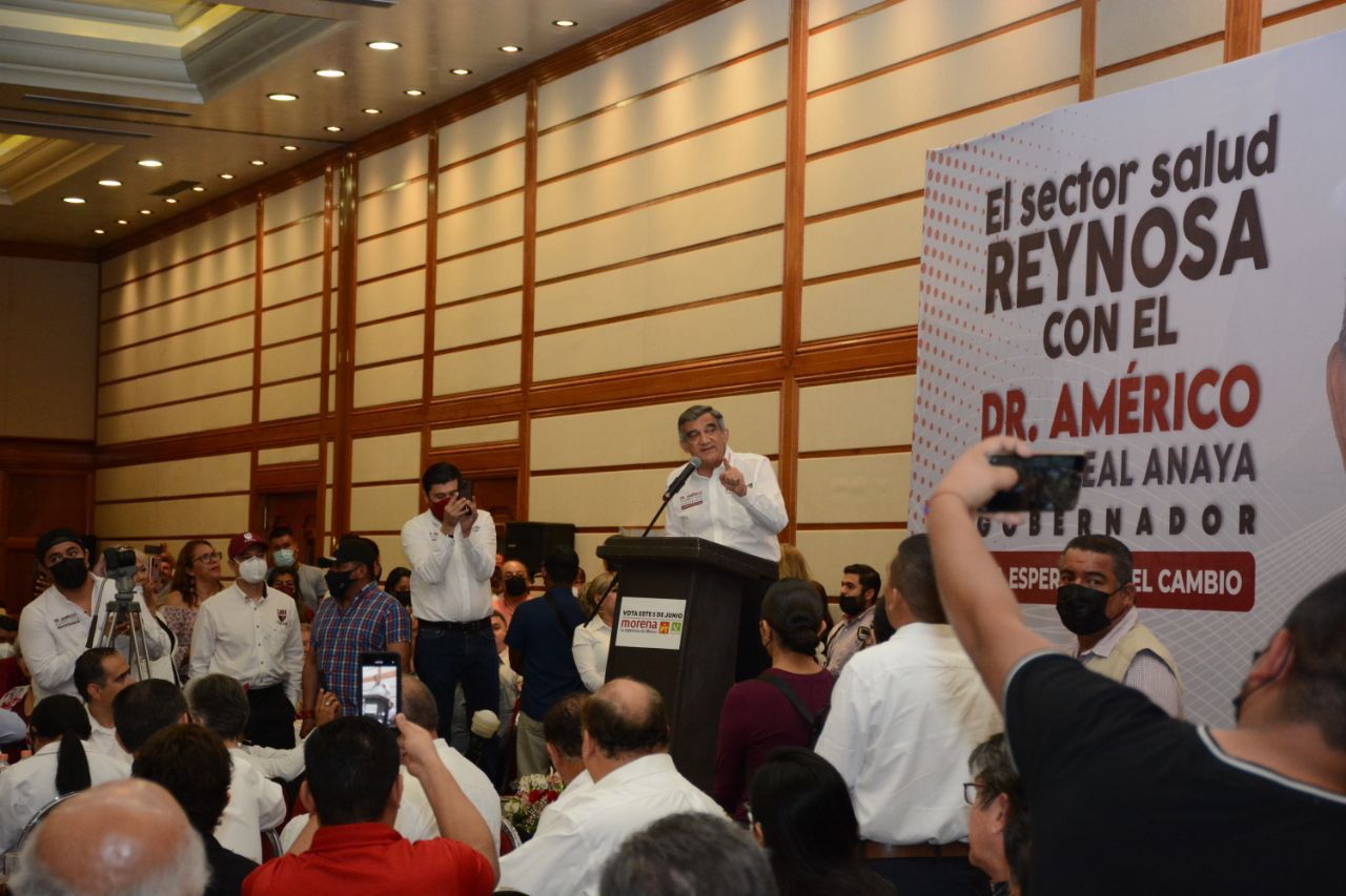 En la primera reunión que tuvo con los profesionistas de la salud y los trabajadores de base, el candidato común de los partidos MORENA-PT-Verde, Américo Villarreal Anaya, acompañado de su esposa, la doctora María de Villarreal, reconoció de pie y con una ovación a sus amigos y hermanos de profesión que perdieron la vida en la línea de batalla en esta pandemia.