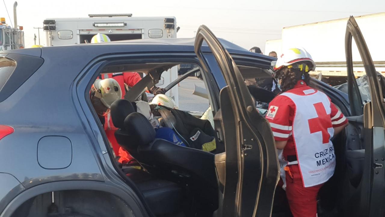 Al reportarse el fuerte carreterazo al número de emergencias 911 acudió el equipo de Rescate Urbano de Cruz Roja Mexicana pues el conductor de la camioneta quedó prensado.