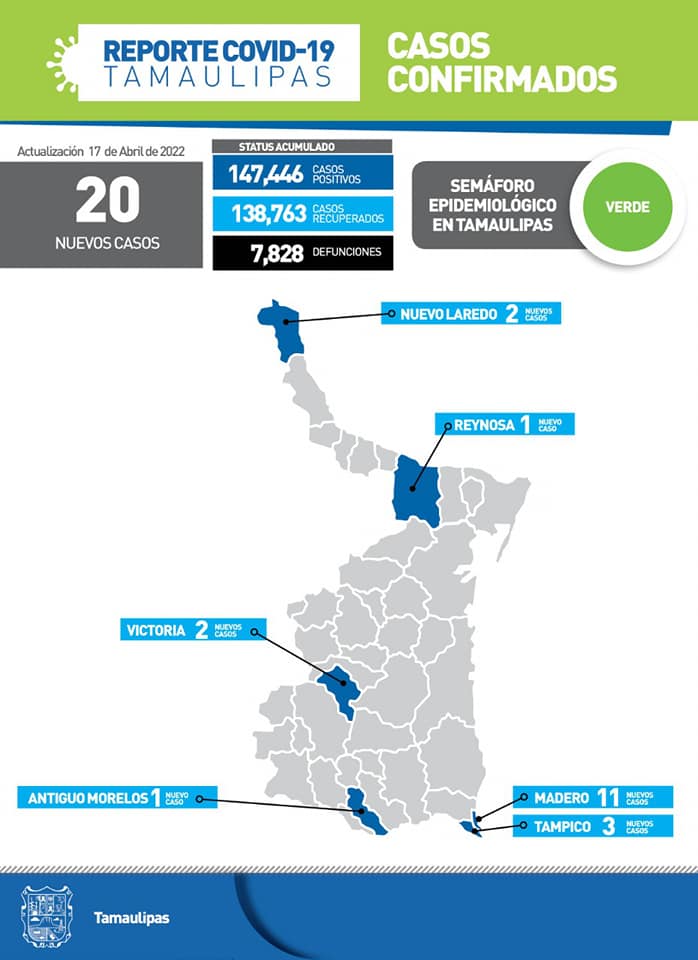 Tamaulipas cerró la jornada de este domingo con 20 nuevos casos de COVID-19 a su conteo oficial, señaló en su reporte diario la Secretaría de Salud.