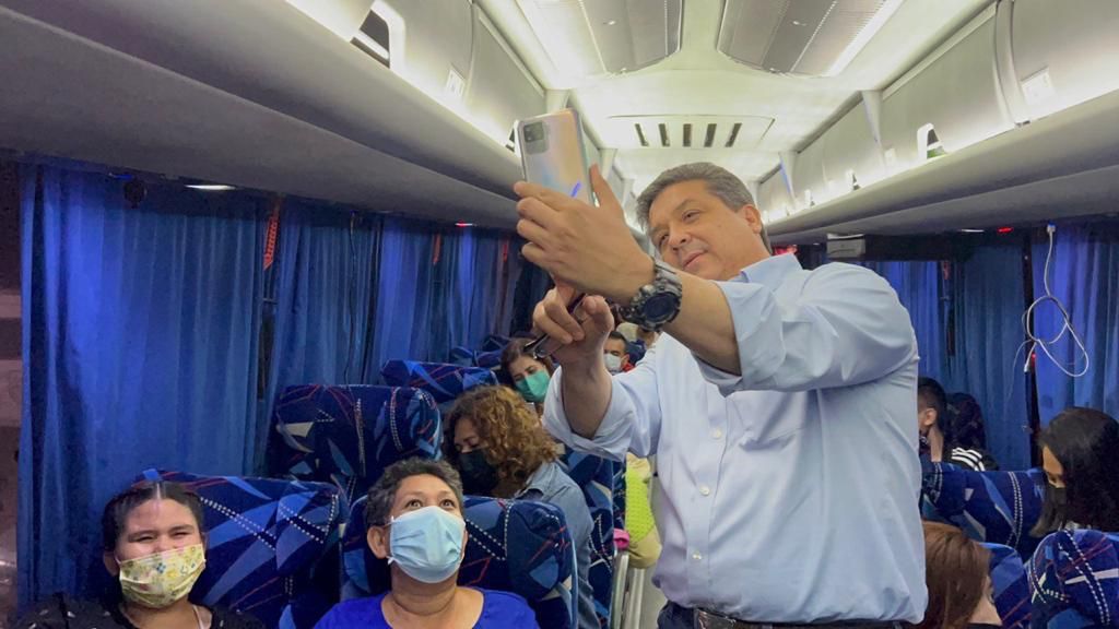 Poco después de las 2 de la mañana de este jueves el mandatario ascendió a algunos de los autobuses que pararon en la llamada “Y”griega de la carretera Victoria -Reynosa - Matamoros y cuyo destino era el municipio de Camargo para cruzar al vecino país en el área de Río Grande y recibir la vacuna contra COVID -19.