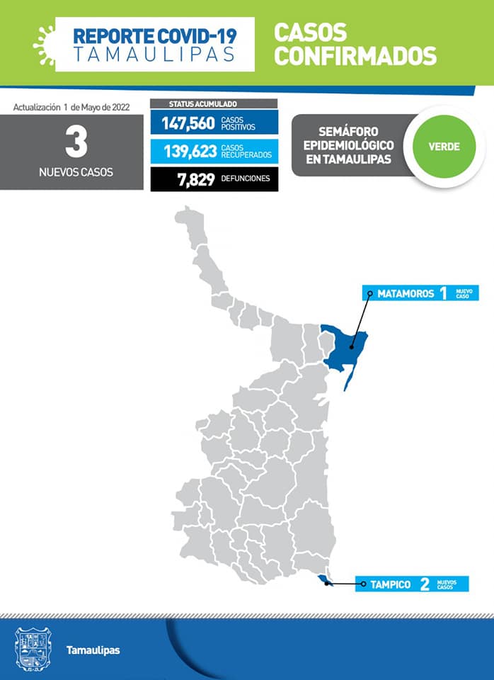 Tamaulipas sumó este domingo 3 nuevos casos a su conteo oficial, informó en su reporte diario la Secretaría de Salud, luego de exhortar a la población a reforzar las medidas de seguridad sanitaria, ya que representan la forma más efectiva de cortar la cadena de transmisión del virus.