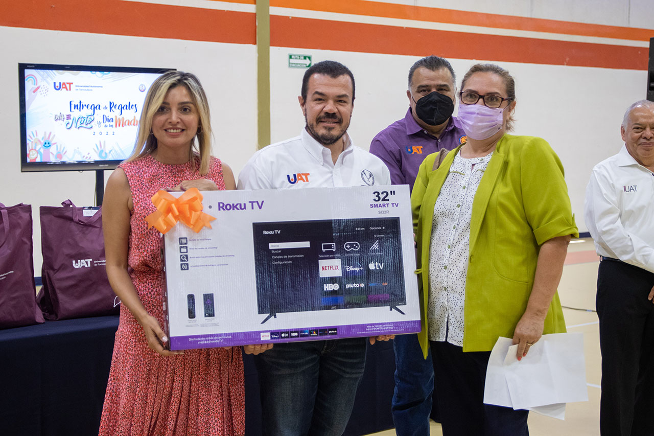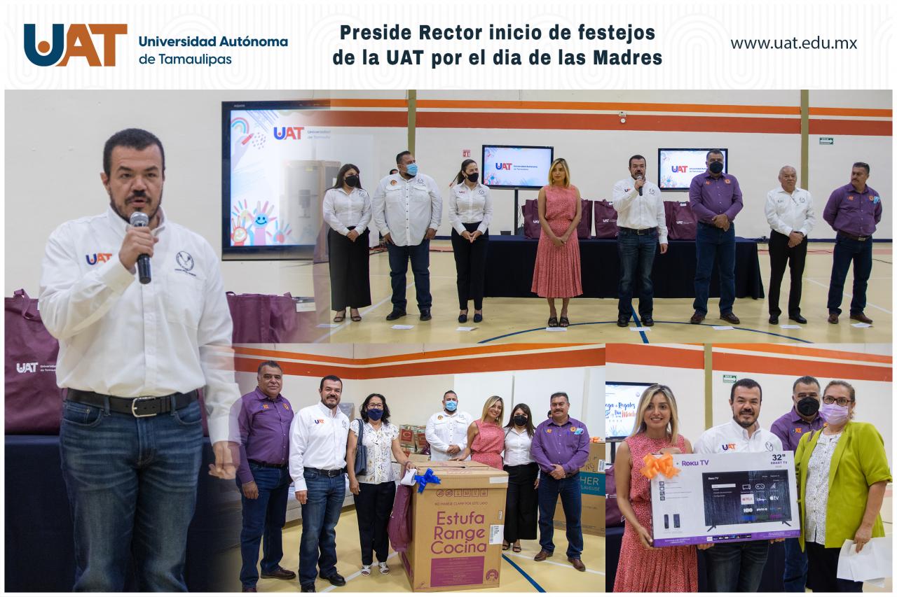 Al iniciar los festejos por la próxima celebración del Día de las Madres, el C. P. Guillermo Mendoza Cavazos, Rector de la Universidad Autónoma de Tamaulipas, presidió la entrega de regalos sorteados por el Sindicato Único de Trabajadores de la UAT a las madres sindicalizadas.