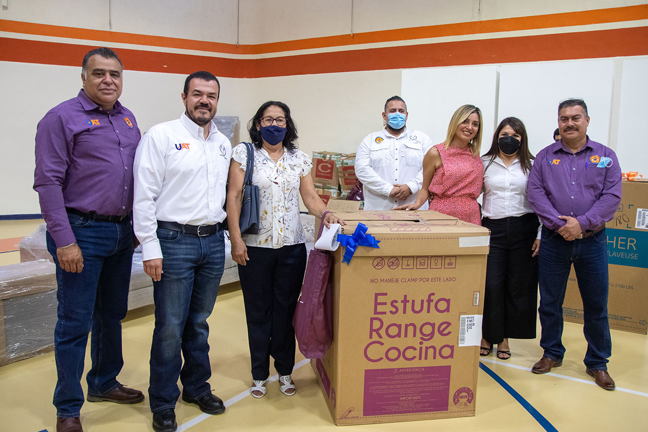 En el evento realizado en el Gimnasio Multidisciplinario de Victoria, el Rector Mendoza Cavazos entregó a las ganadoras de la Sección Centro del SUTUAT los obsequios del reciente sorteo realizado en beneficio de las madres trabajadoras sindicalizadas que laboran en las diferentes dependencias de la Universidad.