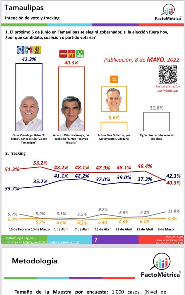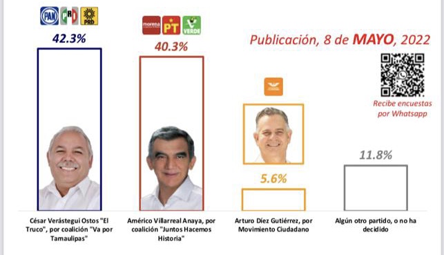 Cabe señalar que estos resultados se dan justamente un mes antes del domingo cinco de junio, día de la jornada electoral en que se habrá de llevar a cabo la elección del próximo gobernador de Tamaulipas para el periodo 2022-2028.