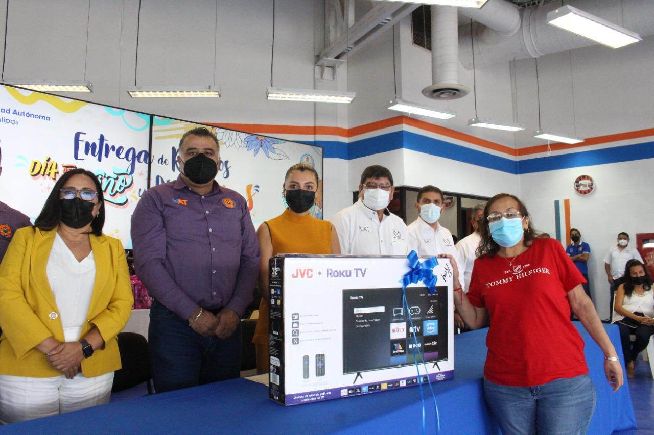 En este contexto, la C. P. Imelda Sustaita de Mendoza, miembro honorario de la Coordinación Ejecutiva de UAT U-NIDO, llevó a cabo dicha entrega de obsequios a las afortunadas ganadoras y de un presente por parte de la Universidad para todas las mamás sindicalizadas, mediante una gira que comprendió las sedes de Ciudad Mante, Victoria, Valle Hermoso, Matamoros, Nuevo Laredo, Reynosa y Tampico, con la presencia del Secretario General estatal del SUTUAT, Óscar Valdez Ávila, y de los respectivos titulares de las secciones sindicales.