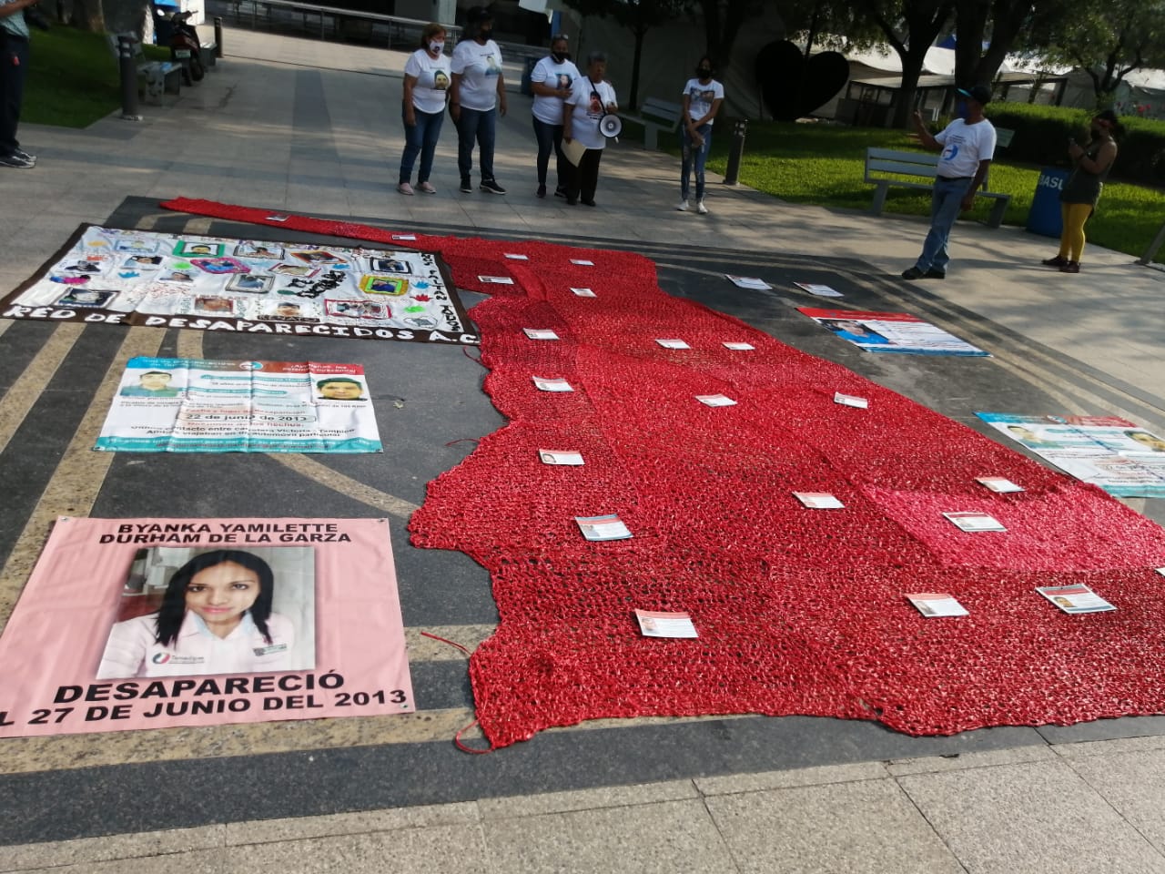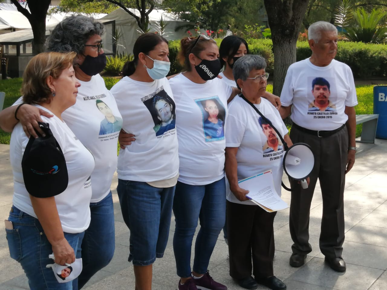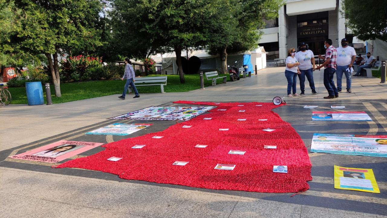 En la plaza Juárez se reunieron las madres de Juan Antonio Quiñonez Martínez, Miguel Angel Solís Guerra, Juan Carlos Villalobos, Linda Guadalupe Rangel Medina, Marco Antonio Ponce Ramírez y Jaime Enrique Alvárez García y otros muchos que conforman la lista de más de once mil desaparecidos en Tamaulipas.
