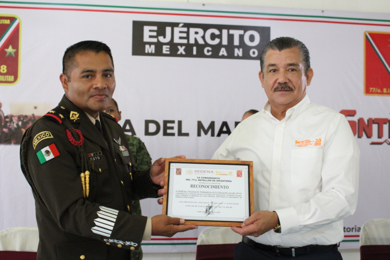 Dentro de las festividades por el “Día del Maestro” y en la coordinación que existe entre el Ejército Mexicano y en Sindicato Nacional de Trabajadores de la Educación, autoridades militares a través del 77/o batallón de Infantería hicieron un reconocimiento a los docentes por el trabajo y entrega en favor de la educación.