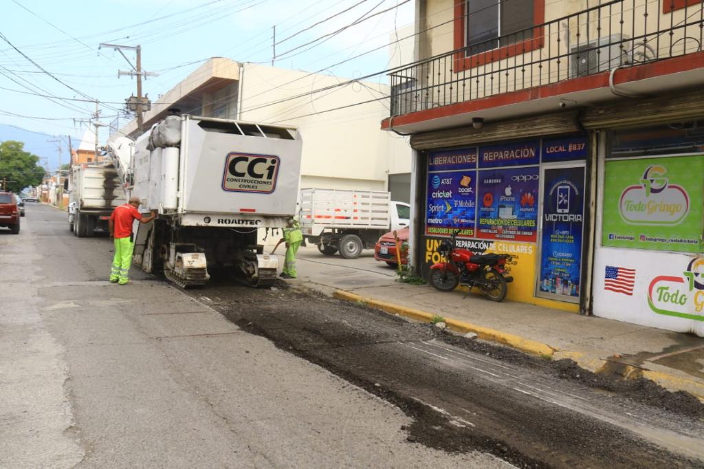 Cd. Victoria.- Con una amplia cobertura en el primer cuadro de la ciudad, el Ayuntamiento de Victoria despliega en las principales vialidades trabajos de rehabilitación de pavimentos dañados que se prolongarán durante los próximos días conforme al avance de las acciones.