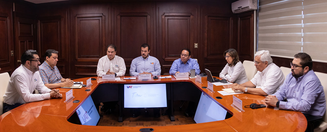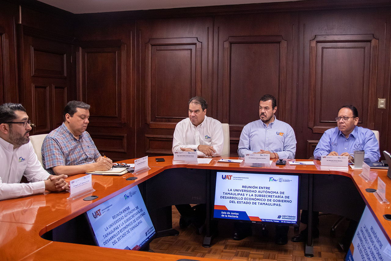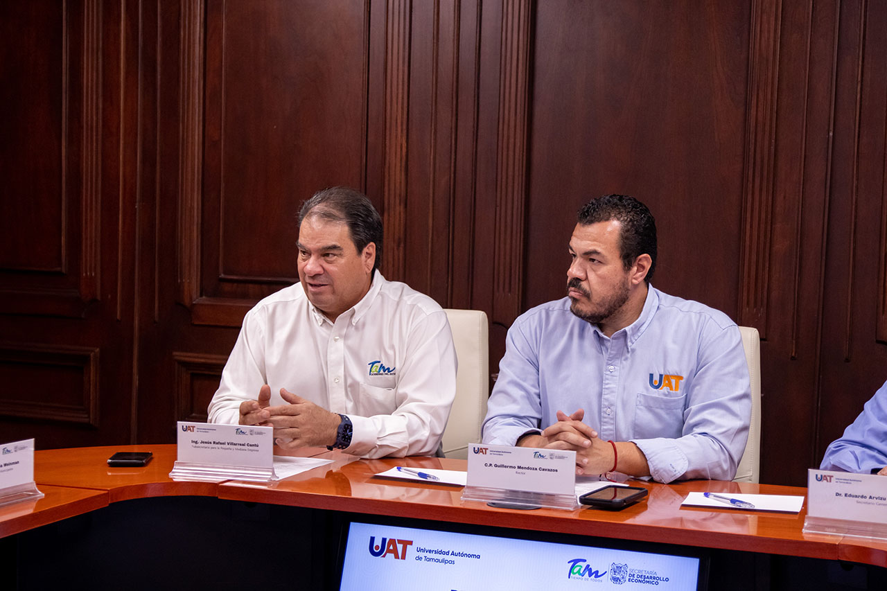 En la reunión efectuada en la sala de juntas de la Administración Central en Ciudad Victoria, el Rector Guillermo Mendoza Cavazos estuvo acompañado del Ing. Jesús Rafael Villarreal Cantú, Subsecretario para la Pequeña y Mediana Empresa del Gobierno de Tamaulipas; el Dr. Eduardo Arvizu Sánchez, Secretario General de la UAT; y la Dra. Mariana Zerón Félix, Secretaria de Investigación y Posgrado de esta casa de estudios.