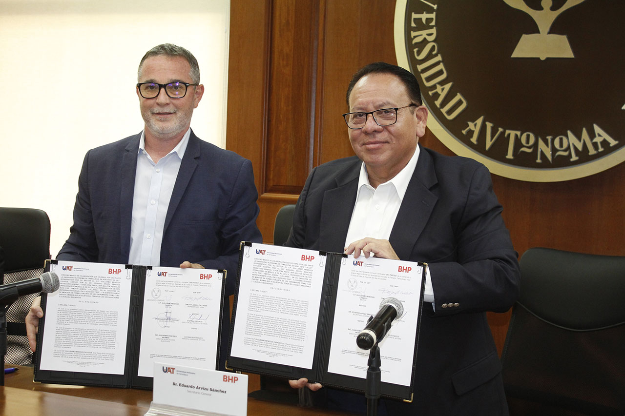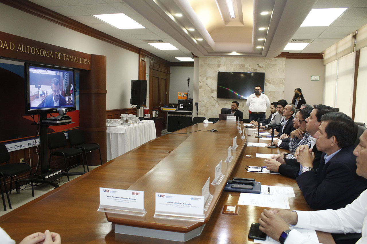 La Universidad Autónoma de Tamaulipas (UAT) y la empresa petrolera australiana BHP firmaron el convenio general de colaboración que derivará en acciones específicas en materia académica, de investigación, formación y especialización de profesionales, así como en acciones que contribuyan con los sectores productivos y el desarrollo de la entidad.