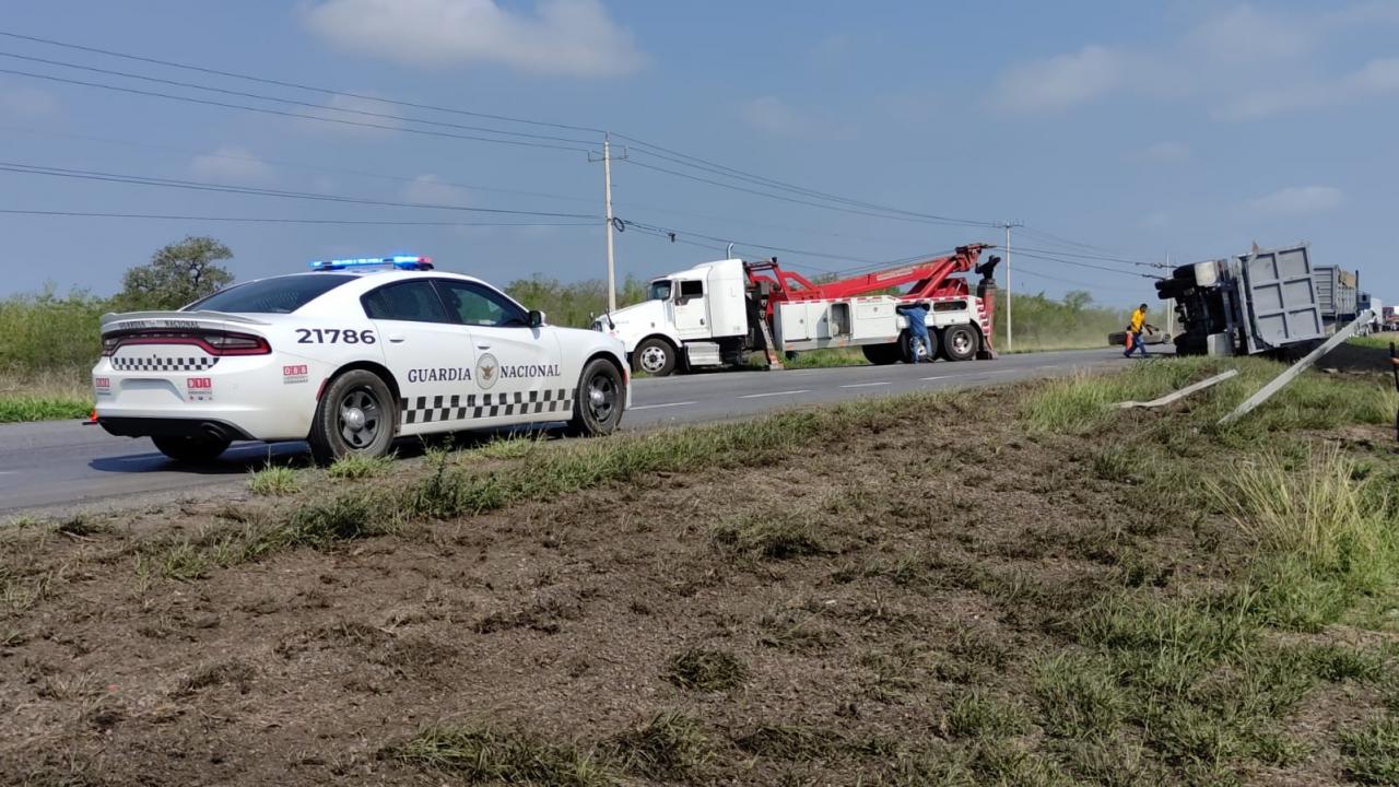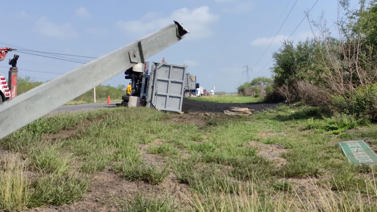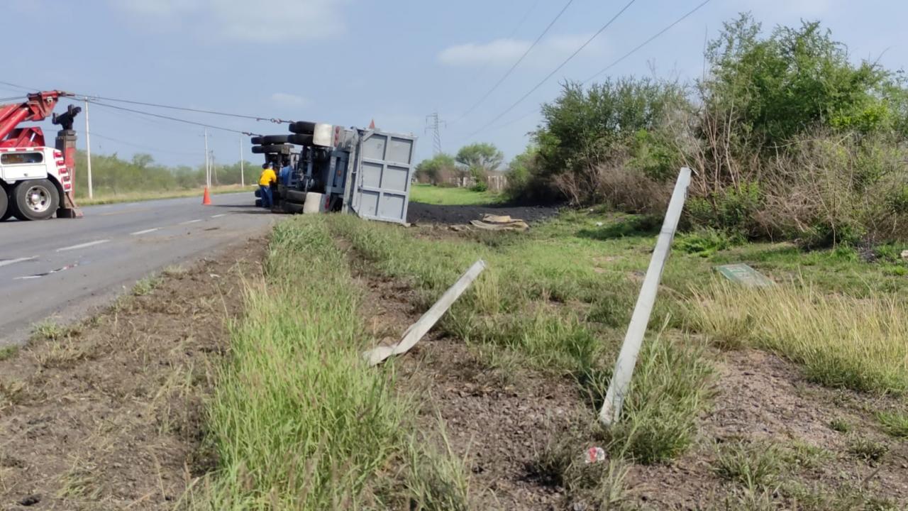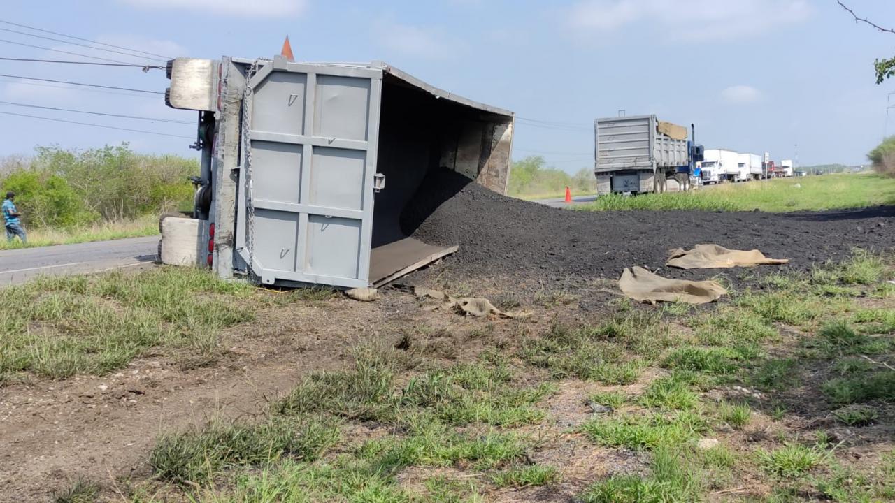 A consecuencia de una presunta dormitada de su operador, el segundo contenedor de un tráiler que transportaba varias toneladas de material asfáltico quedó volcado a un costado de la carretera Victoria Monterrey.