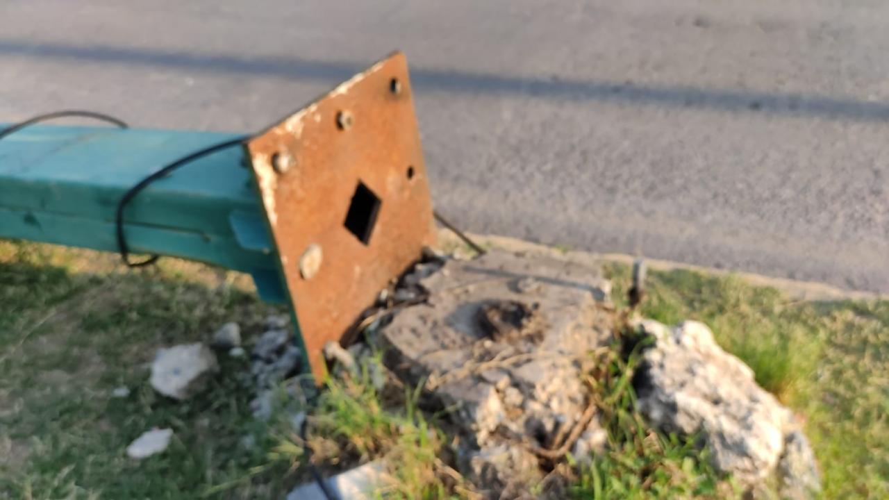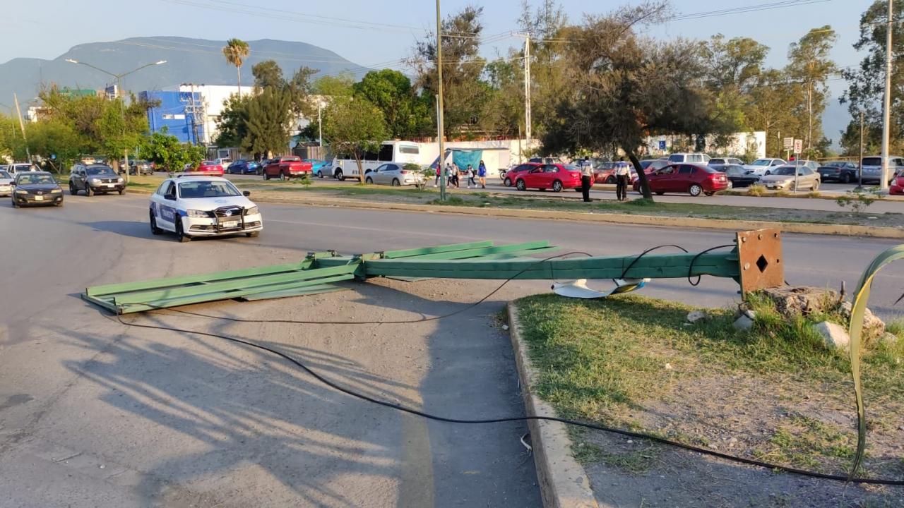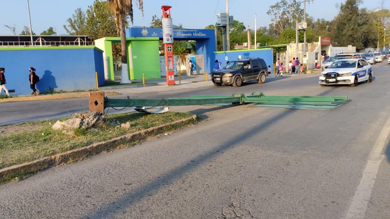 Al caer al suelo, la señal informativa quedó tirada frente a la entrada de la Preparatoria Federalizada Número Dos Aniceto Villanueva Martínez.