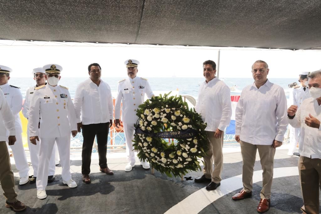 Madero, Tam.- El Gobernador Francisco García Cabeza de Vaca, acompañado del Comandante de la Primera Zona Naval, Héctor Pineda Cruz, presidieron la ceremonia conmemorativa al Día de la Marina Nacional, a fin de reconocer la dedicación y valentía de marinos y pilotos que resguardan el desarrollo marítimo.