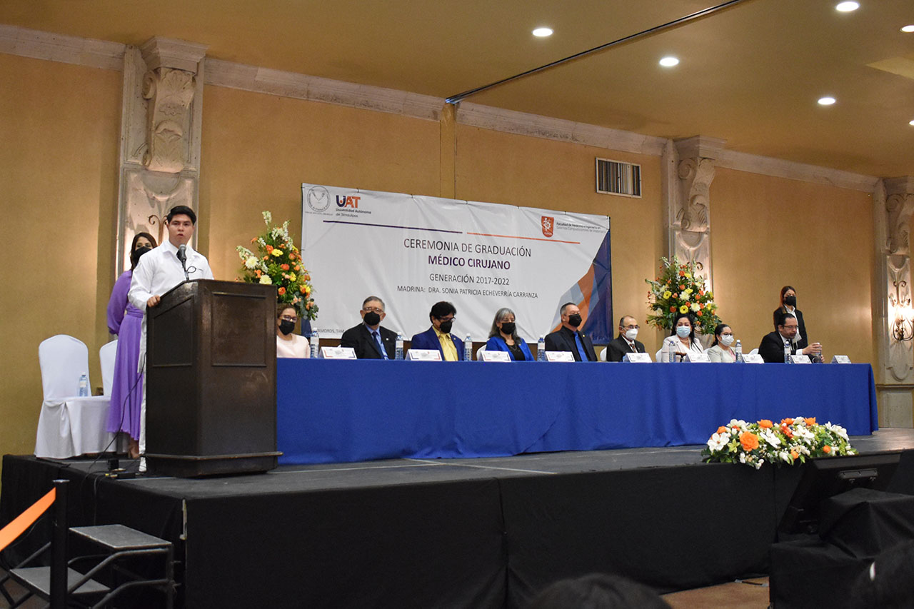 A nombre de la generación 2017-2022 de Médico Cirujano, Jesús Alberto Hernández Luna brindó unas palabras dedicadas a sus compañeros y un mensaje de gratitud a los familiares por el apoyo brindado para lograr su formación académica.