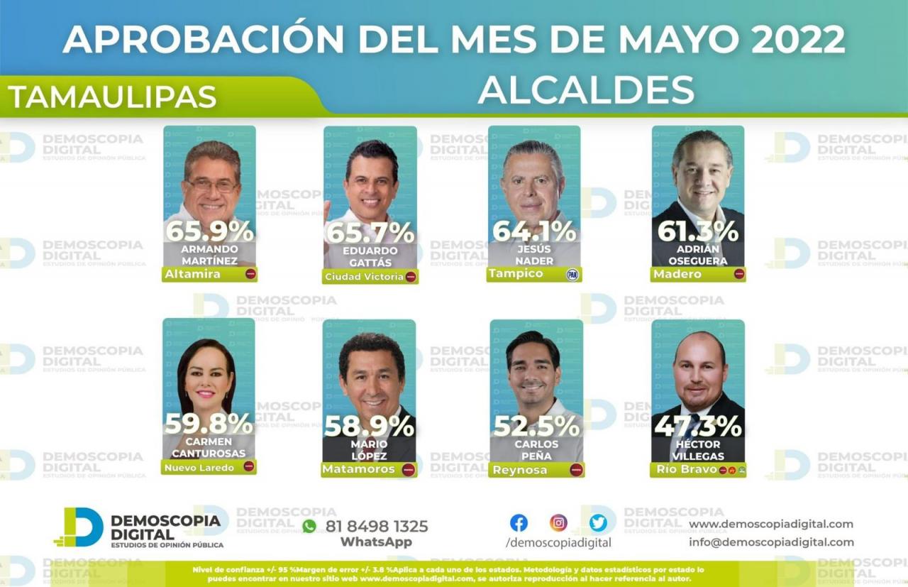 Resalta observar, que los tres primeros lugares lo ocupan los alcaldes de Altamira, Victoria y Tampico, con un lugar porcentual del 65.9, 65.7 y 64.1% respectivamente. Los dos primeros lugares, corresponden a alcaldes del grupo Morena, y el tercer lugar, el alcalde por Tampico (ver cuadro anexo).