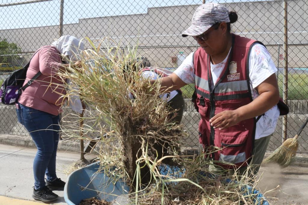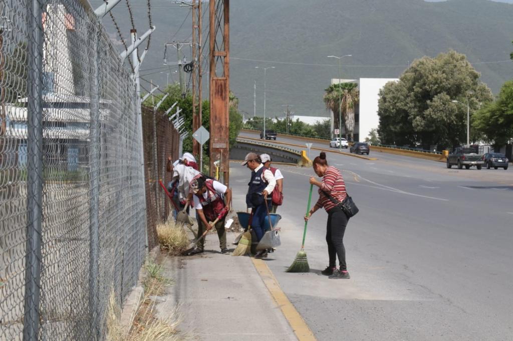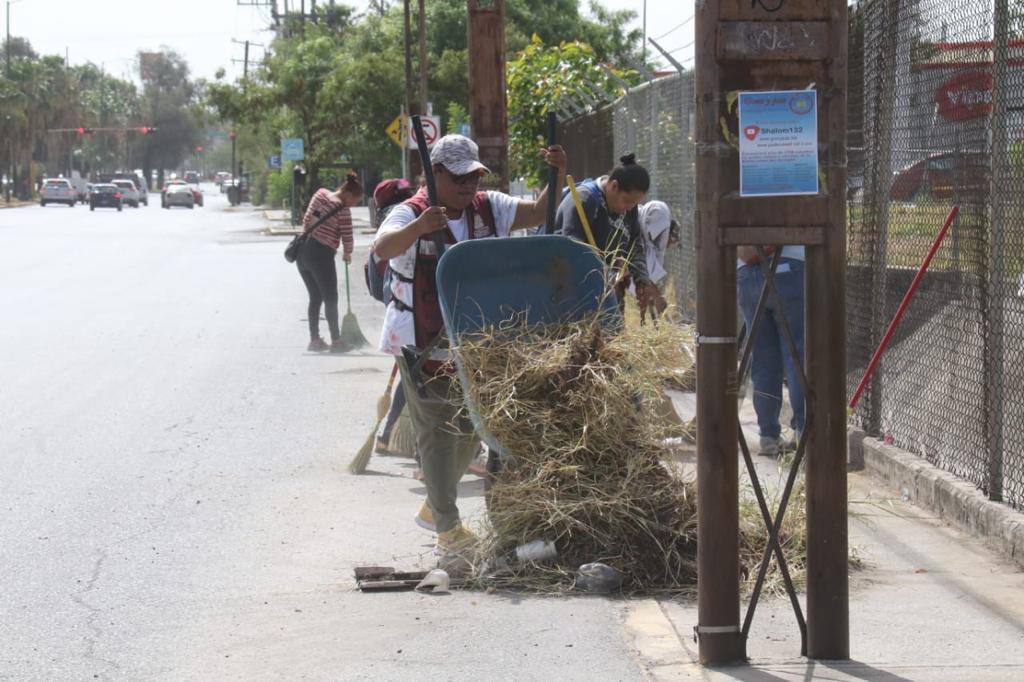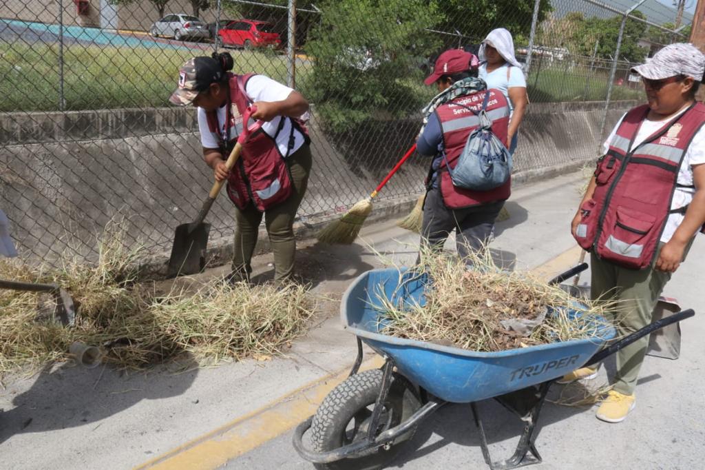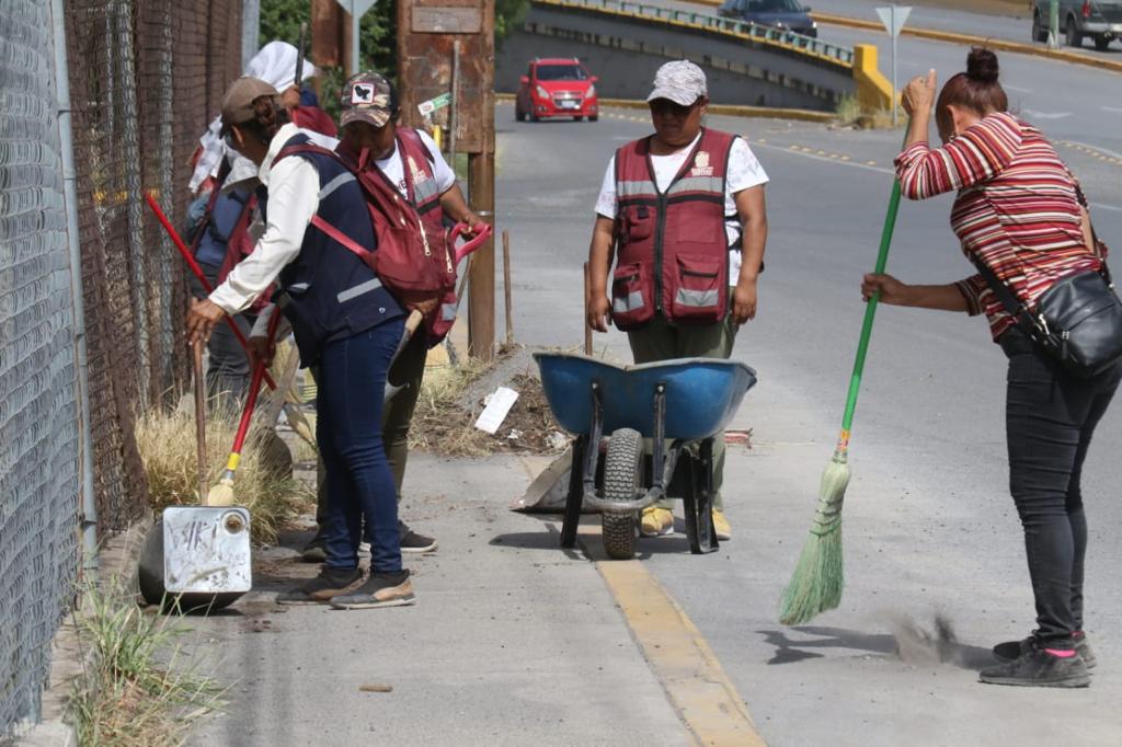 A temprana hora, cuadrillas de la Secretaría de Servicios Públicos iniciaron acciones en la calle José Elías Piña del conjunto habitacional Fidel Velázquez con trabajos de barrido manual y retiro de maleza en aceras peatonales, mientras que personal de Obras Públicas dio continuidad a los trabajos de desazolve del dren pluvial.