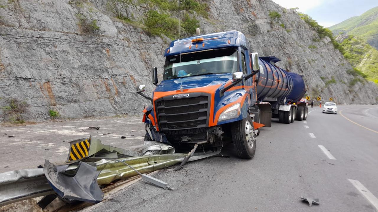Derribando a su paso un tramo de una barrera metálica de contención así como diversos señalamientos informativos, la pesada unidad avanzó sobre el dren pluvial que se encuentra paralelo a la carretera.