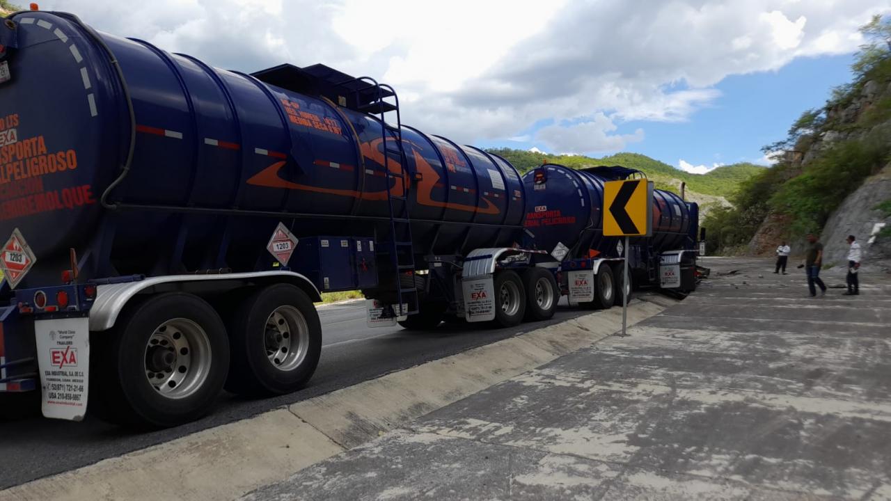A consecuencia de una presunta falla mecánica un tráiler tipo pipa doble remolque quedó fuera de control cuando circulaba por la carretera Rumbo Nuevo.