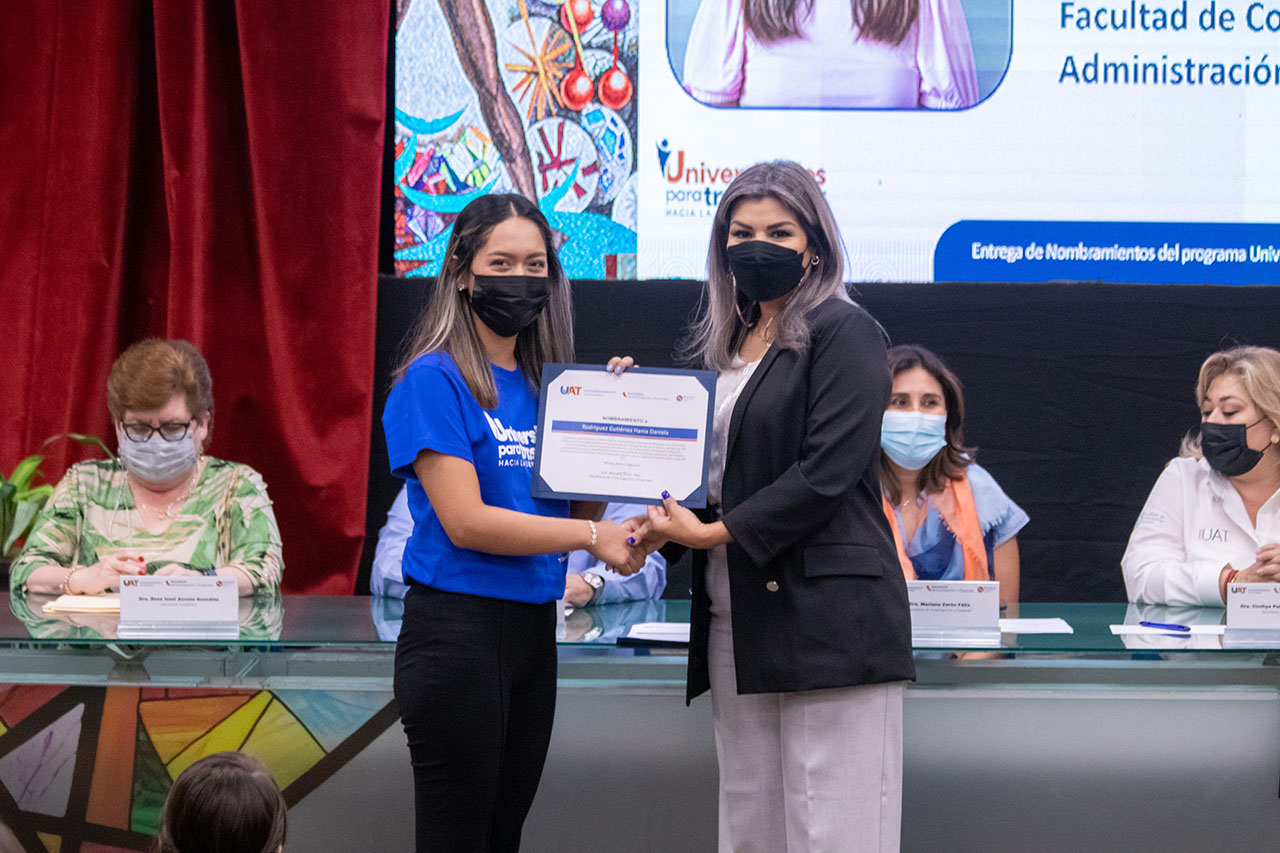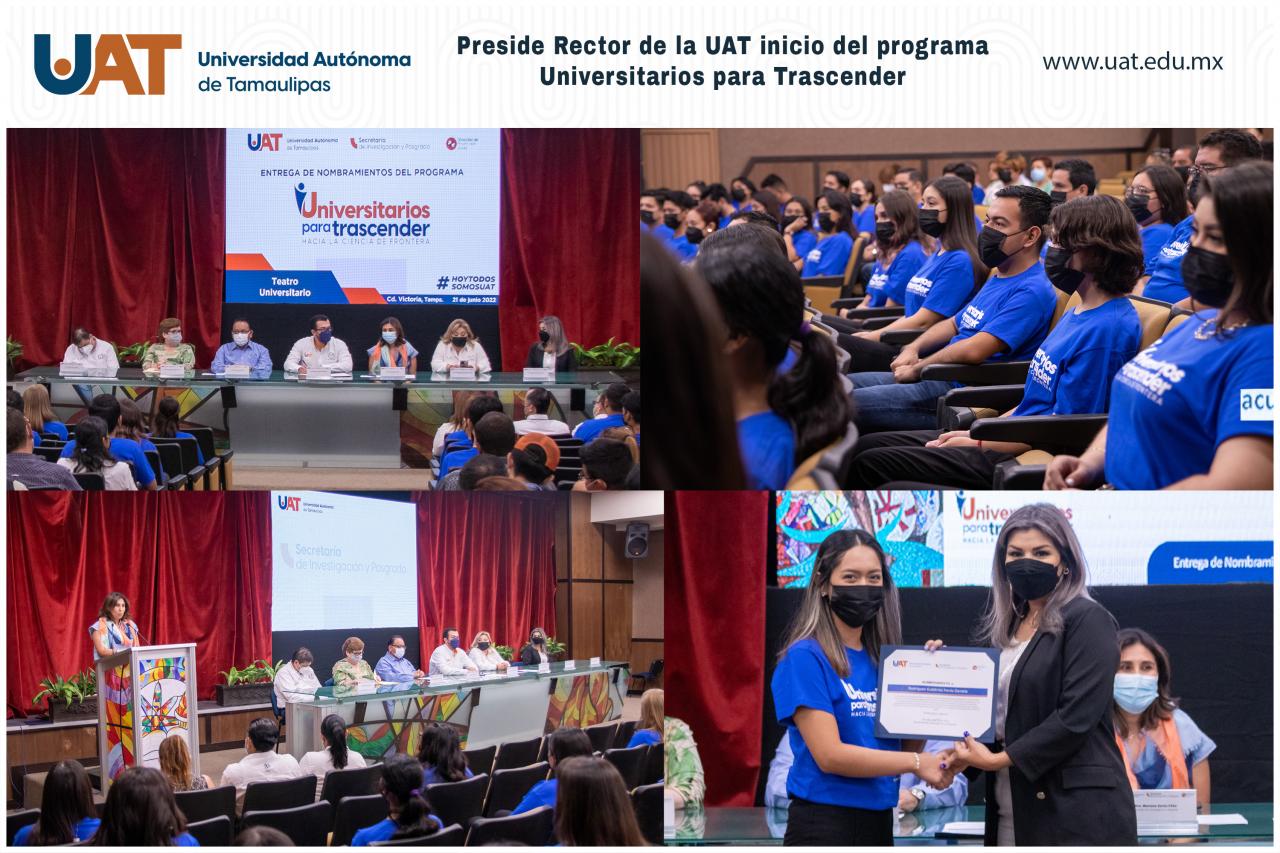 El C. P. Guillermo Mendoza Cavazos, Rector de la Universidad Autónoma de Tamaulipas (UAT), presidió la ceremonia de entrega de nombramientos a cincuenta y un estudiantes de nivel medio superior, superior y de posgrado de esta casa de estudios que integran la primera generación del programa Universitarios para Trascender.