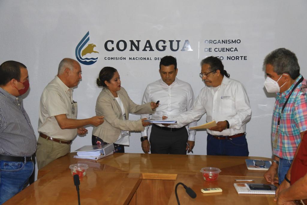 Acompañado del gerente general de COMAPA, Eliseo García Leal, y María Gamboa Herrera, representante legal de la empresa Proyectos Ejecutivos del Golfo (PEGSA), entregó a Juan Pablo Pérez Parra, secretario técnico del organismo regulador del agua, el documento con el estudio técnico