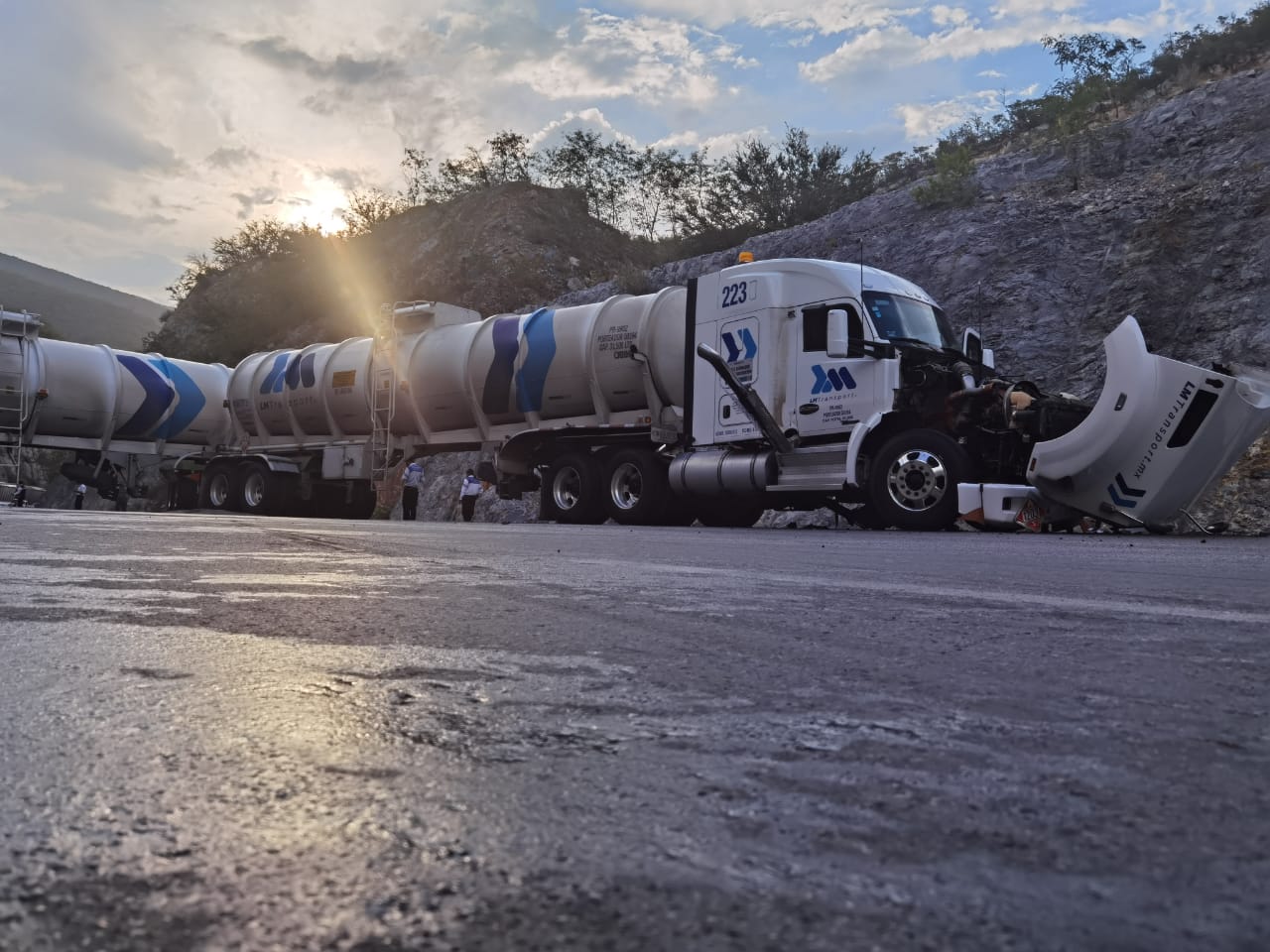 En su posición final la pipa con doble contenedor y razón social LM Transport quedó atravesada sobre la carretera Rumbo Nuevo obstruyendo totalmente la circulación.