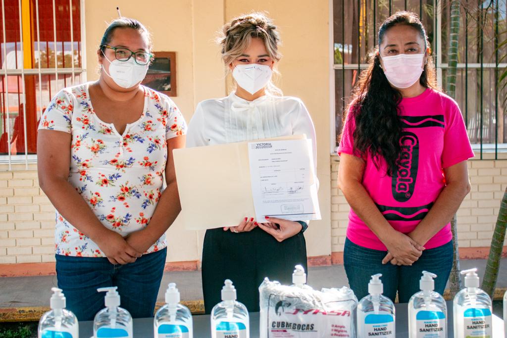 Cd. Victoria.- Derivado del incremento de contagios de SARS-CoV-2, el Sistema DIF que preside la Sra. Lucia Rodríguez de Gattás se sumó a la campaña de entrega de gel antibacterial y cubrebocas en instituciones educativas.
