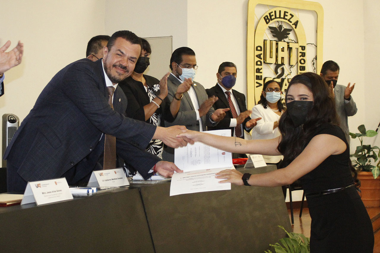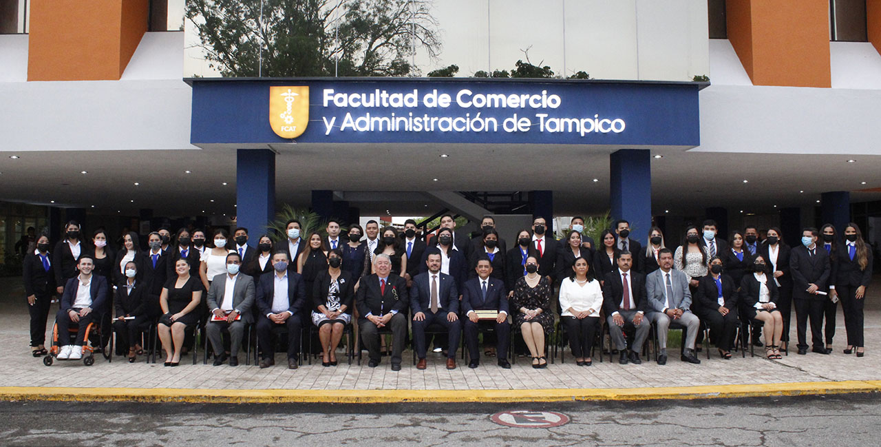 En el marco de este evento académico, la UAT entregó una generación integrada por cuarenta y nueve estudiantes de las licenciaturas en Contador Público, Administración y Negocios Internacionales.