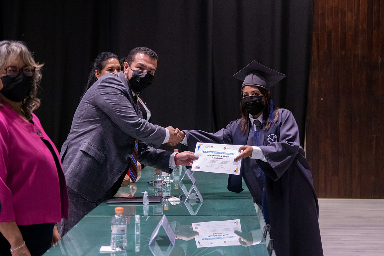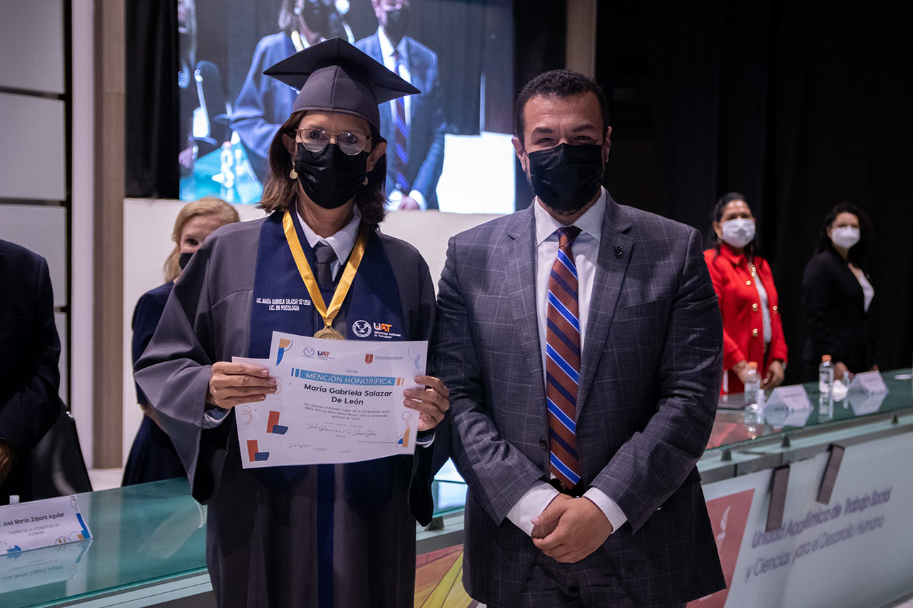 En el marco de esta ceremonia, se entregó la Medalla al Mérito Académico Mtra. Mirna Maribel Medrano Vargas a María Gabriela Salazar de León, egresada de la carrera de Psicología, por obtener el promedio más alto de toda la generación. Fue ella quien dirigió un emotivo mensaje en representación de los graduados.