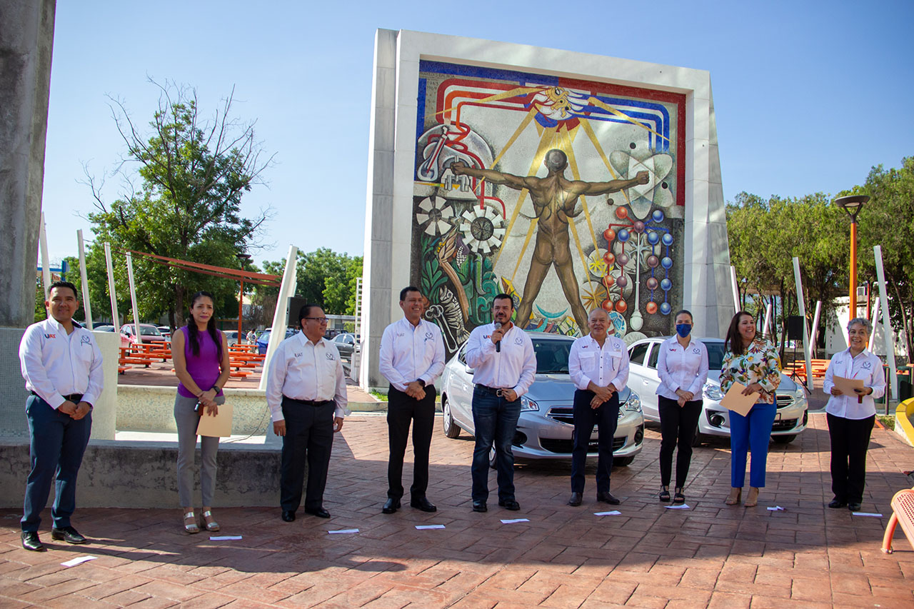 El C. P. Guillermo Mendoza Cavazos, Rector de la Universidad Autónoma de Tamaulipas (UAT), entregó los tres vehículos que fueron sorteados entre el personal docente del Sindicato Único de Trabajadores Académicos (SUTAUAT), en cumplimiento del compromiso establecido en el contrato colectivo laboral.