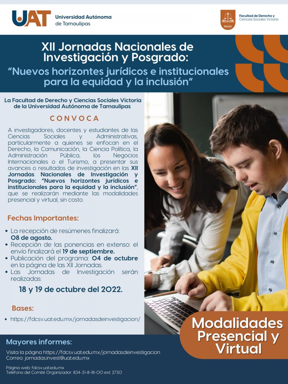 La Facultad de Derecho y Ciencias Sociales Victoria (FDCSV) de la Universidad Autónoma de Tamaulipas (UAT) organiza las XII Jornadas Nacionales de Investigación y Posgrado denominadas “Nuevos horizontes jurídicos e institucionales para la equidad y la inclusión".