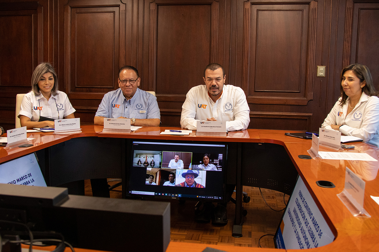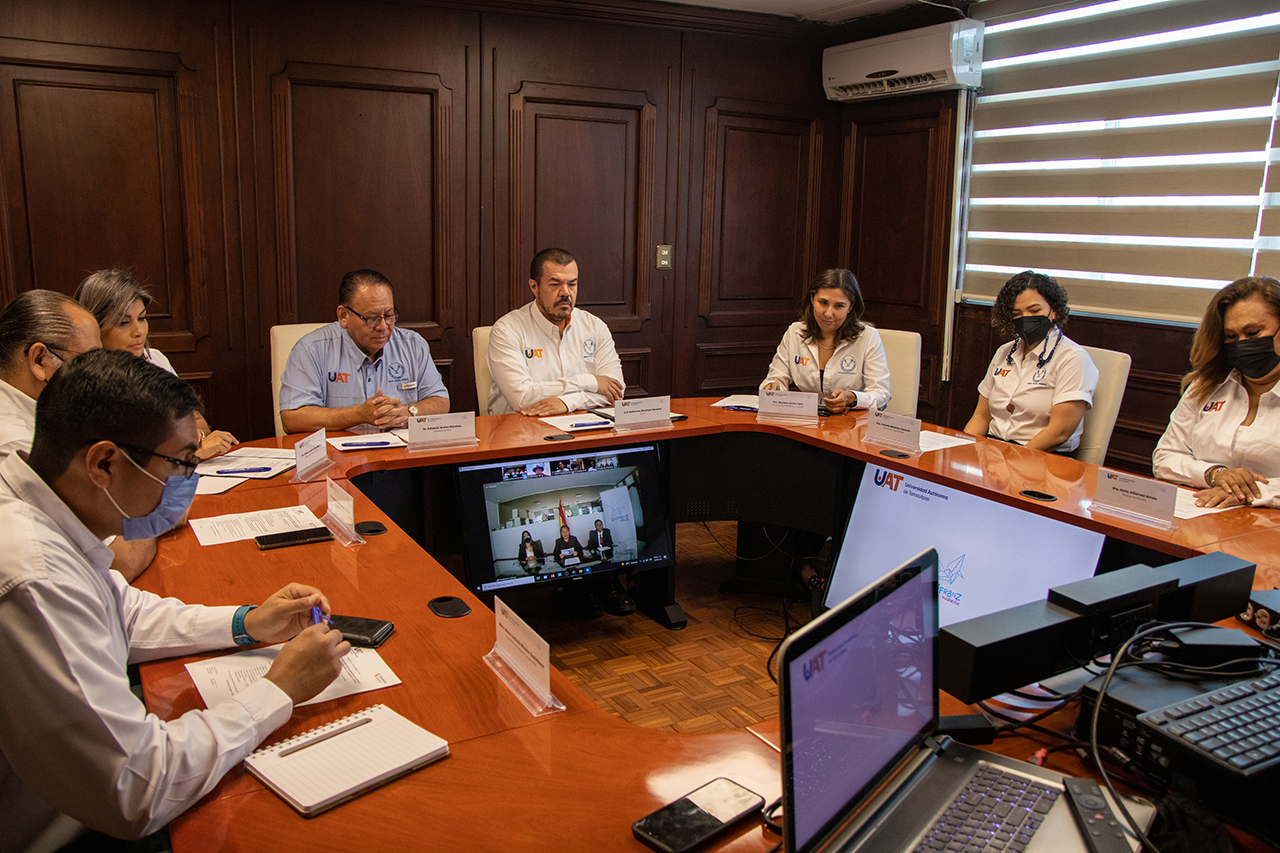 Desde la sala de juntas del edificio de la Rectoría en esta capital, el C. P. Guillermo Mendoza Cavazos, Rector de la UAT, presidió la ceremonia protocolaria efectuada por videoconferencia con la Lic. María del Pilar Juliana Hidalgo Araoz, Directora Ejecutiva de la UNIFRANZ.