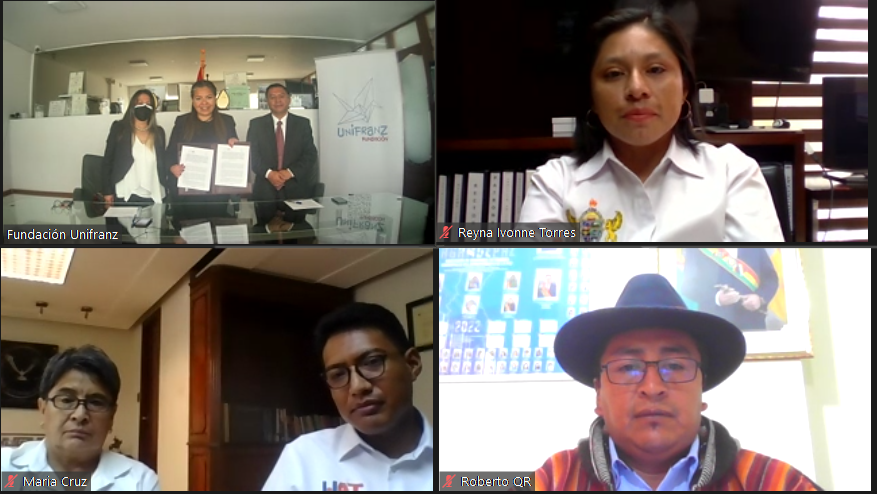Por videoconferencia desde Bolivia, estuvieron presentes, Simona Quispe Apaza, Primera Vicepresidenta de la Cámara de Senadores del Estado Plurinacional de Bolivia; Edwin Hilarí Condori, Alcalde de Carabuco; la Dra. Tatiana Lena Aguilar Torrico, coordinadora del Departamento de Investigación de UNIFRANZ; Nancy Nayma Huanca Calle, Directora de la Asociación de Mujeres en Acción Bolivia; y el C. Víctor Hugo Velásquez Morales, Director Administrativo Financiero.