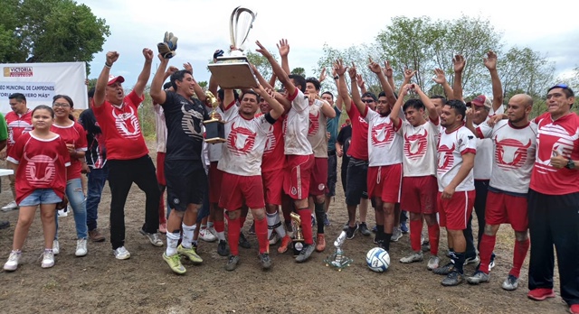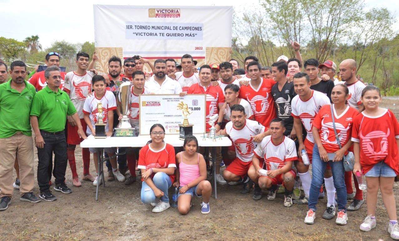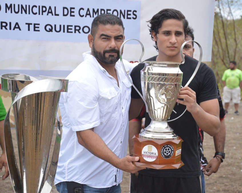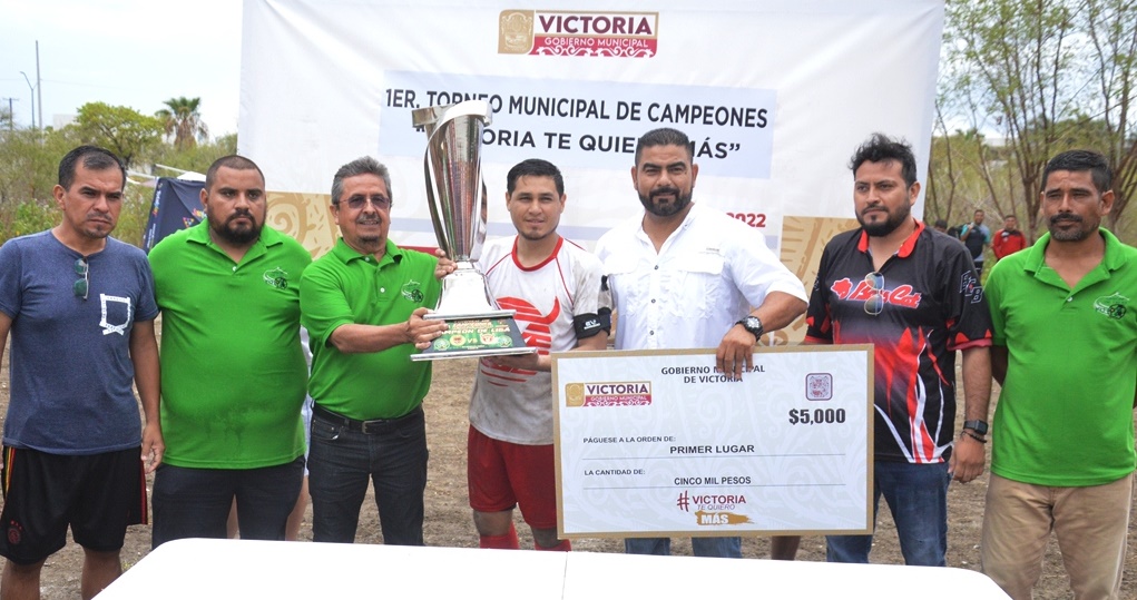 Ciudad Victoria.- El Gobierno Municipal de Eduardo Abraham Gattás Báez, premió con vistosos trofeos a los ganadores del Primer Torneo de Campeones de Fut-7 “Victoria te quiero más”, en donde el equipo Toros de la Colonia Reforma resultó monarca al vencer con global de 4-2 al conjunto de El Volcán FC de la Colonia Mainero.