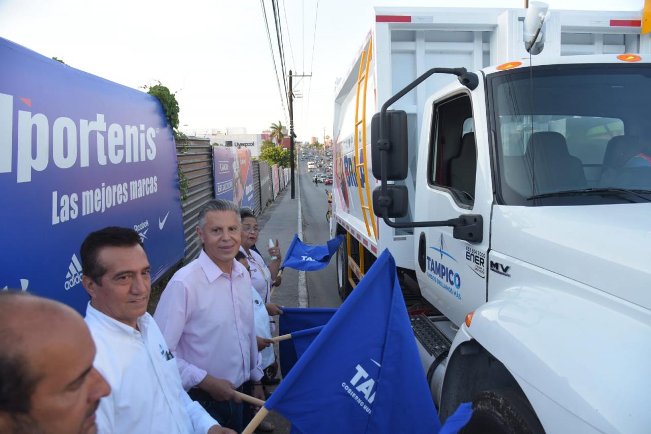 El mandatario explicó que dentro del programa Tampico Brilla, durante los últimos cuatro años se ha modernizado y ampliado la flota de camiones recolectores de basura, lo que ha posibilitado brindar una cobertura total en este servicio.