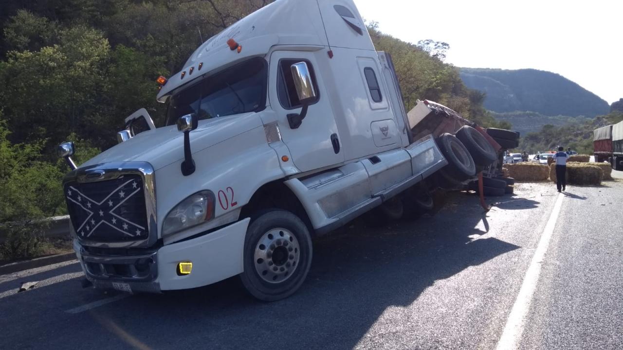 Tras reportarse la volcadura de un tráiler al número de emergencias 911 al lugar acudieron elementos de la Dirección de Seguridad, Tránsito y Vialidad así como agentes de la Policía Estatal y personal de Ángeles Azules de auxilio carretero para coadyuvar en las labores de vialidad.