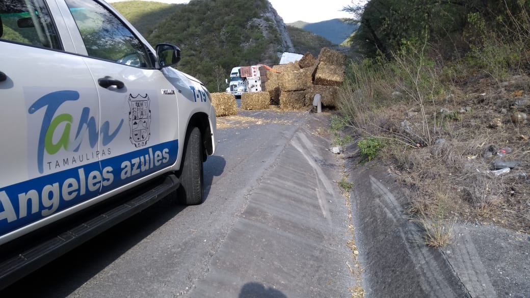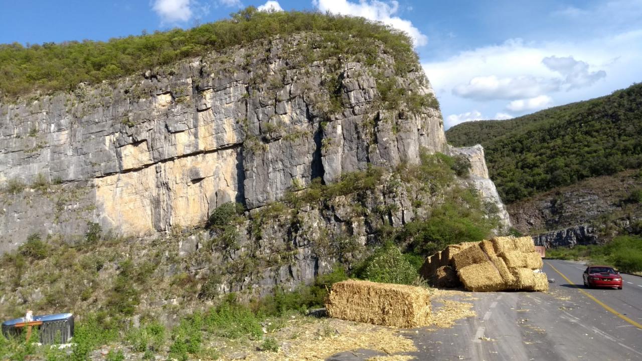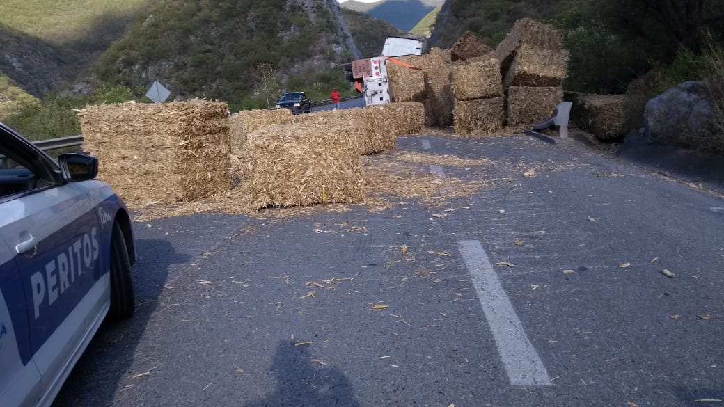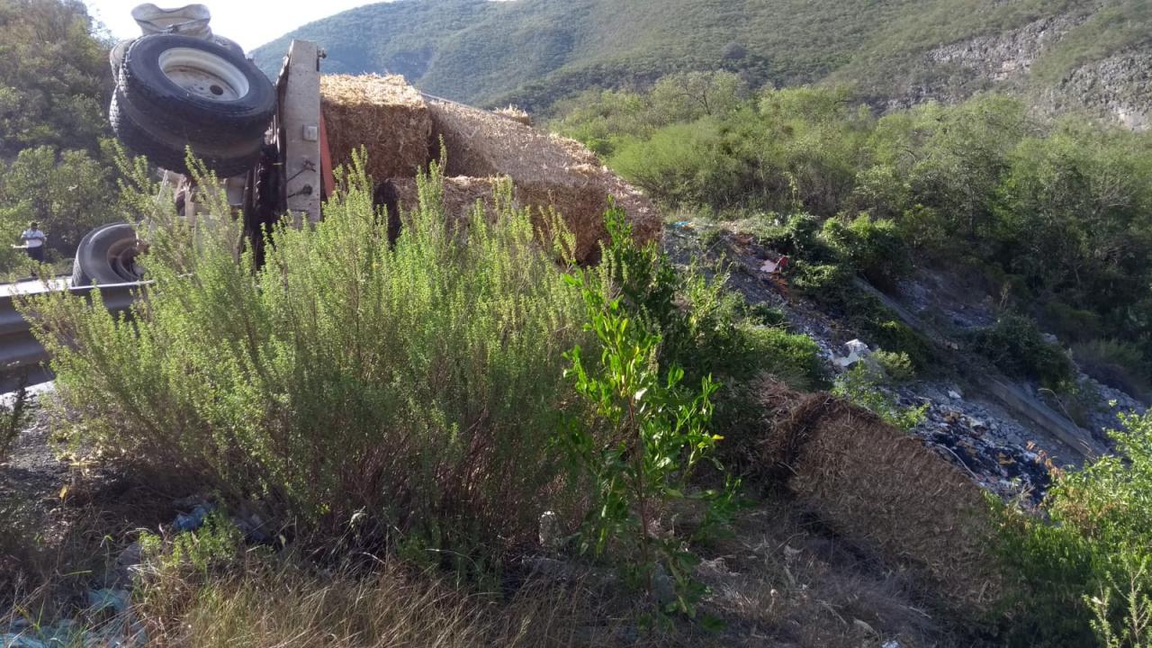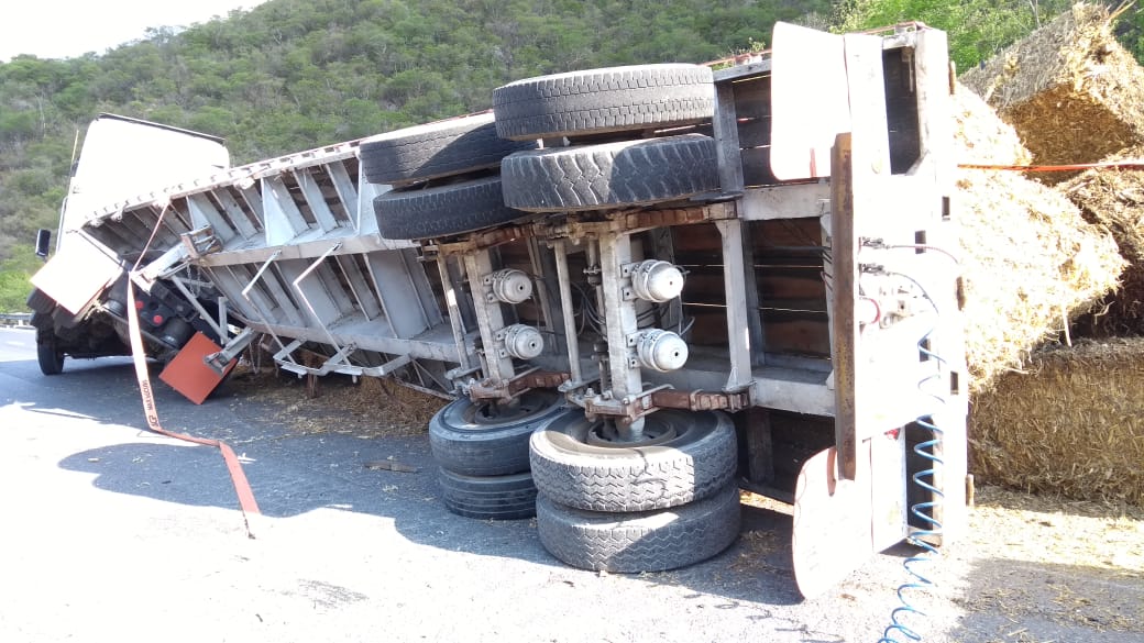 Dejando la segunda plataforma tirada y obstruyendo la carretera con las pacas de forraje para ganado, la pesada unidad fuera de control continuó su camino para finalmente quedar semi volcado a la altura del kilómetro 16 aproximadamente, en donde también quedó obstruida parcialmente la vialidad.