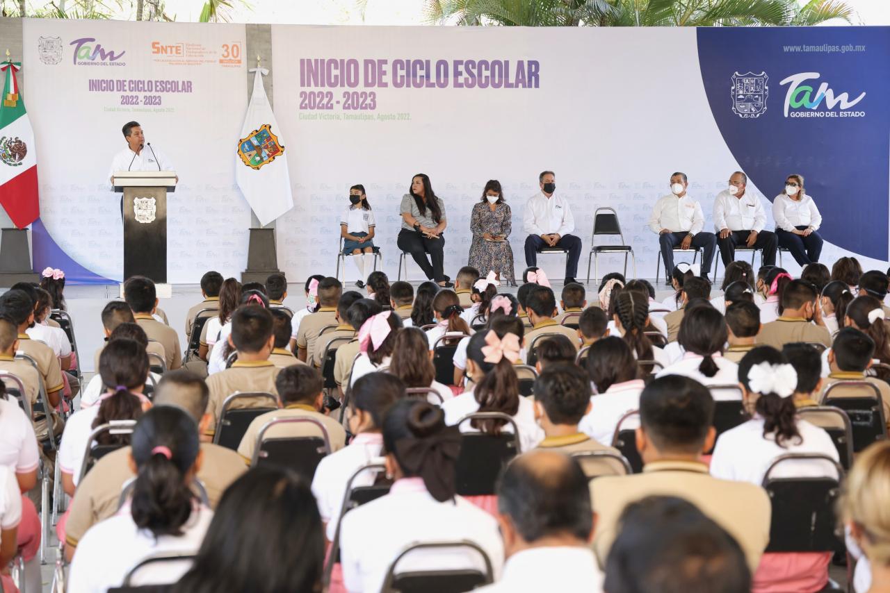 Ciudad Victoria, Tamaulipas.- Este lunes, el Gobernador Francisco García Cabeza de Vaca inauguró el ciclo escolar 2022-2023 al que se incorporan un total de 972 mil 817 alumnos, 53 mil 710 docentes, en más de 6 mil 444 escuelas, en los 43 municipios del estado.