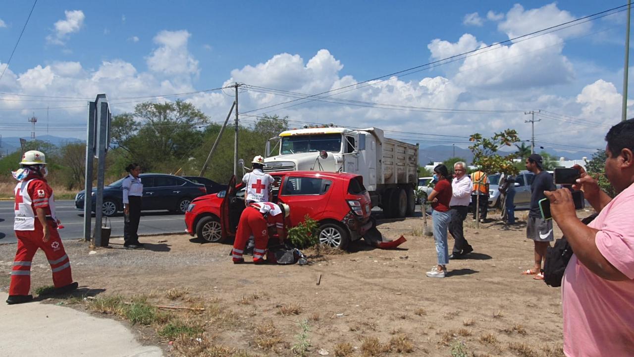 En el accidente ocasionado por una presunta falla mecánica en el sistema de frenos del camión de volteo, una mujer que viajaba en el automóvil resultó lesionada.