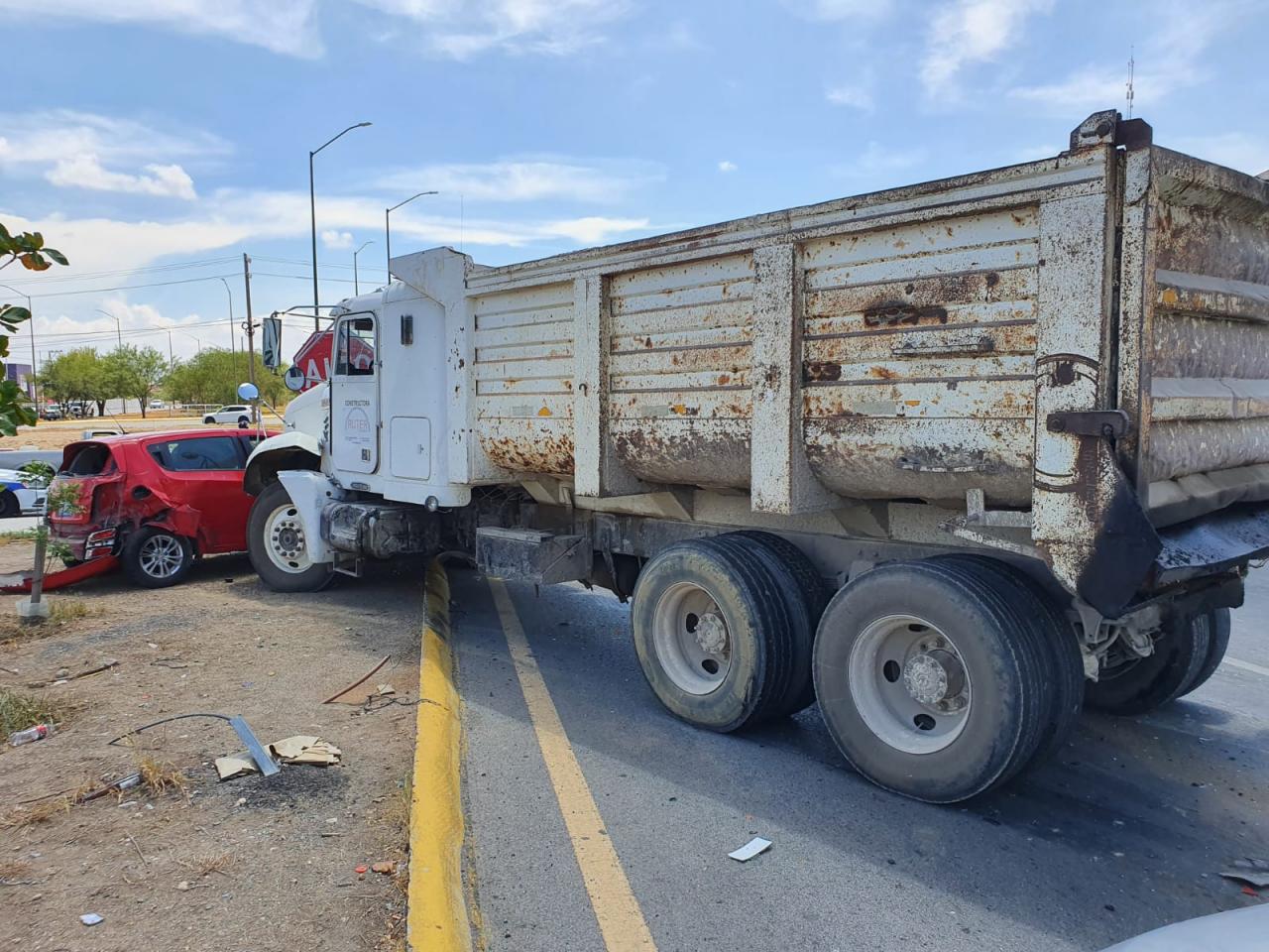 Tras ser impactado, el vehículo compacto fue arrastrado por el camión de volteo fuera de la superficie de rodamiento vehicular para quedar sobre el camellón divisor de carriles del libramiento Naciones Unidas.