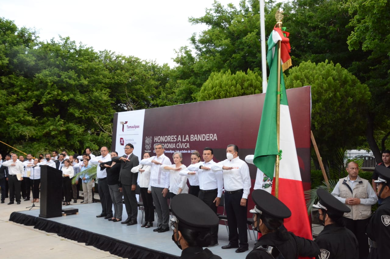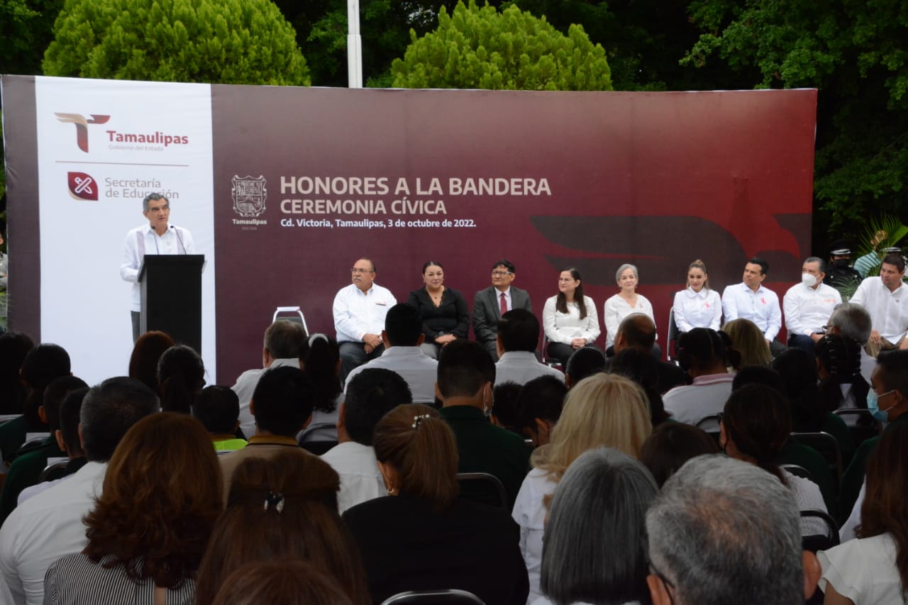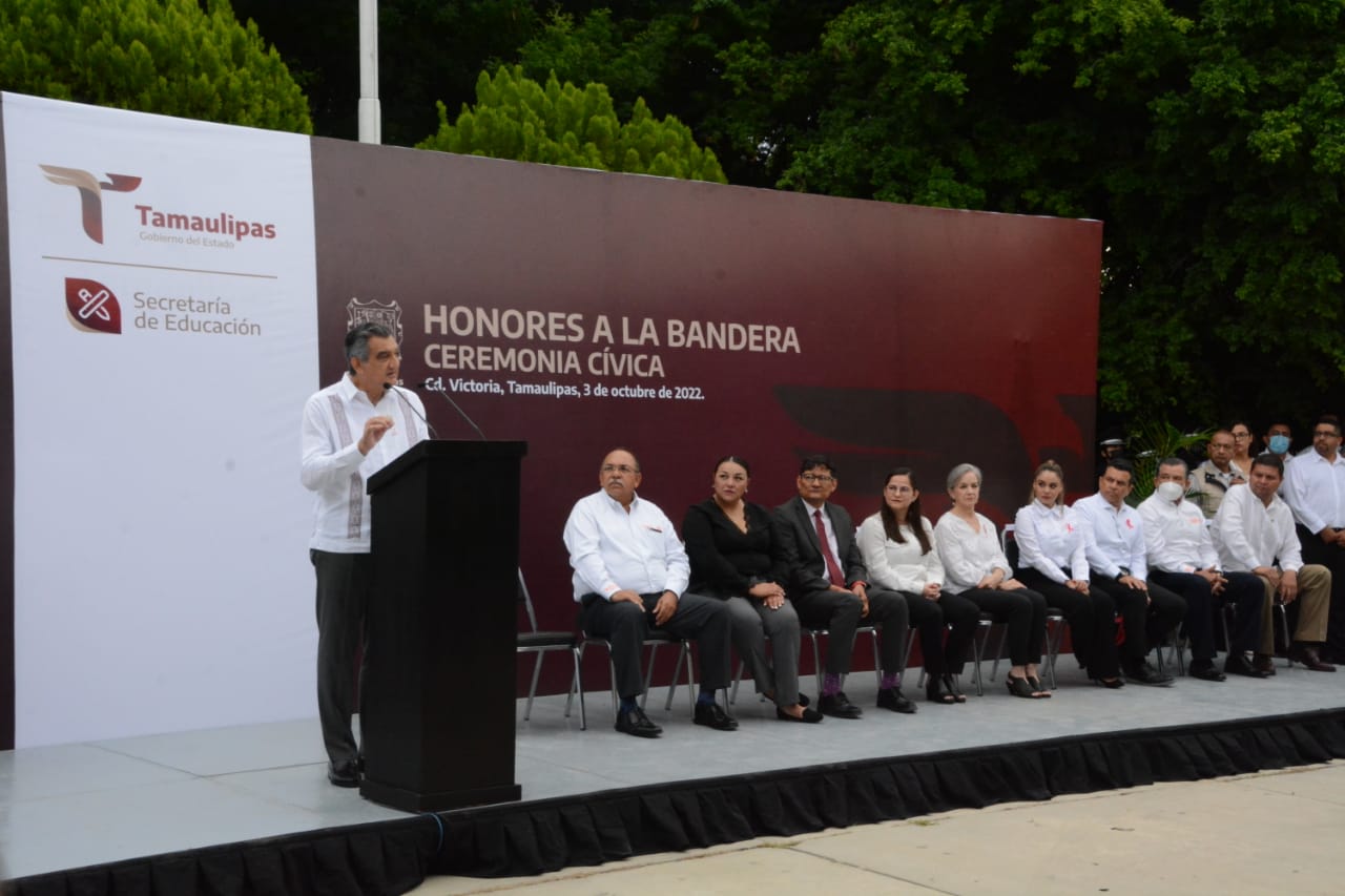 Cd. Victoria, Tamaulipas, 3 de octubre de 2022.- El gobernador Américo Villarreal Anaya presidió la primera ceremonia cívica de honores a la bandera y ante la estructura educativa del Estado, llamó a unir esfuerzos para combatir el rezago en el sector y que en Tamaulipas la educación sea verdaderamente transformadora.