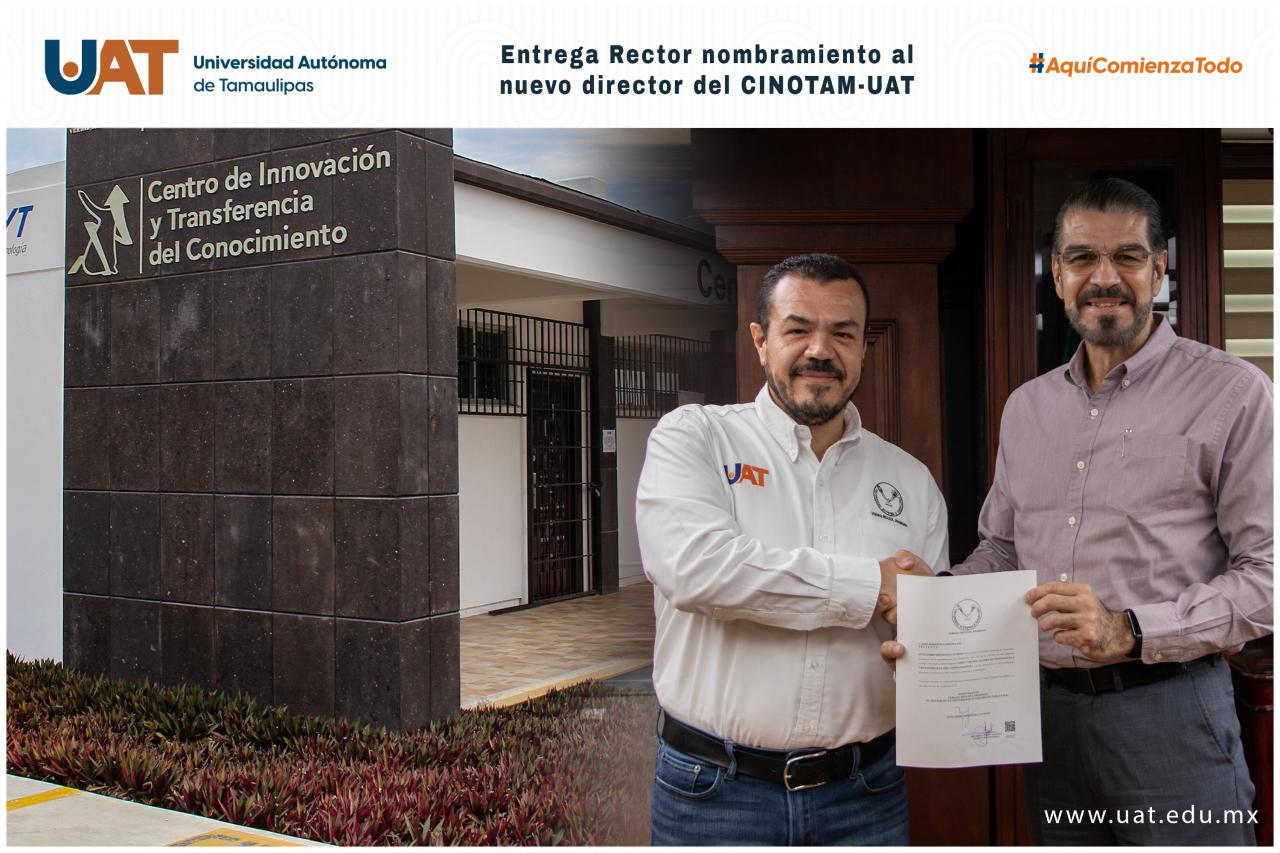 El C. P. Guillermo Mendoza Cavazos, rector de la Universidad Autónoma de Tamaulipas (UAT), entregó al Dr. José Roberto Campos Leal el nombramiento como director del Centro de Innovación y Transferencia del Conocimiento (CINOTAM) de esta casa de estudios.