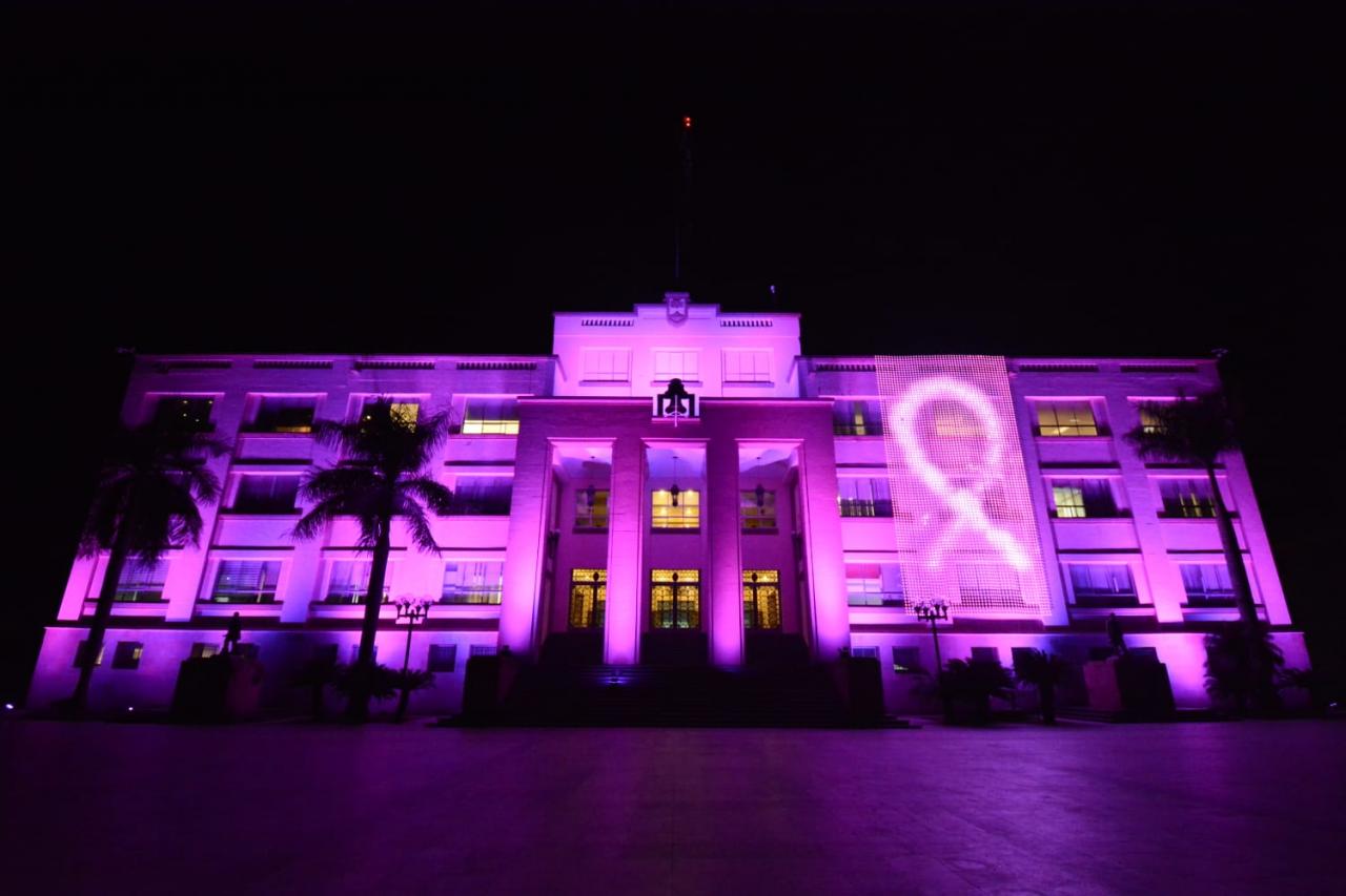 Ciudad Victoria, Tamaulipas.- Con la finalidad de concientizar a la población de la importancia de la prevención del cáncer de mama por medio de un diagnóstico oportuno, el Palacio de Gobierno de Tamaulipas ha sido iluminado de color rosa.
