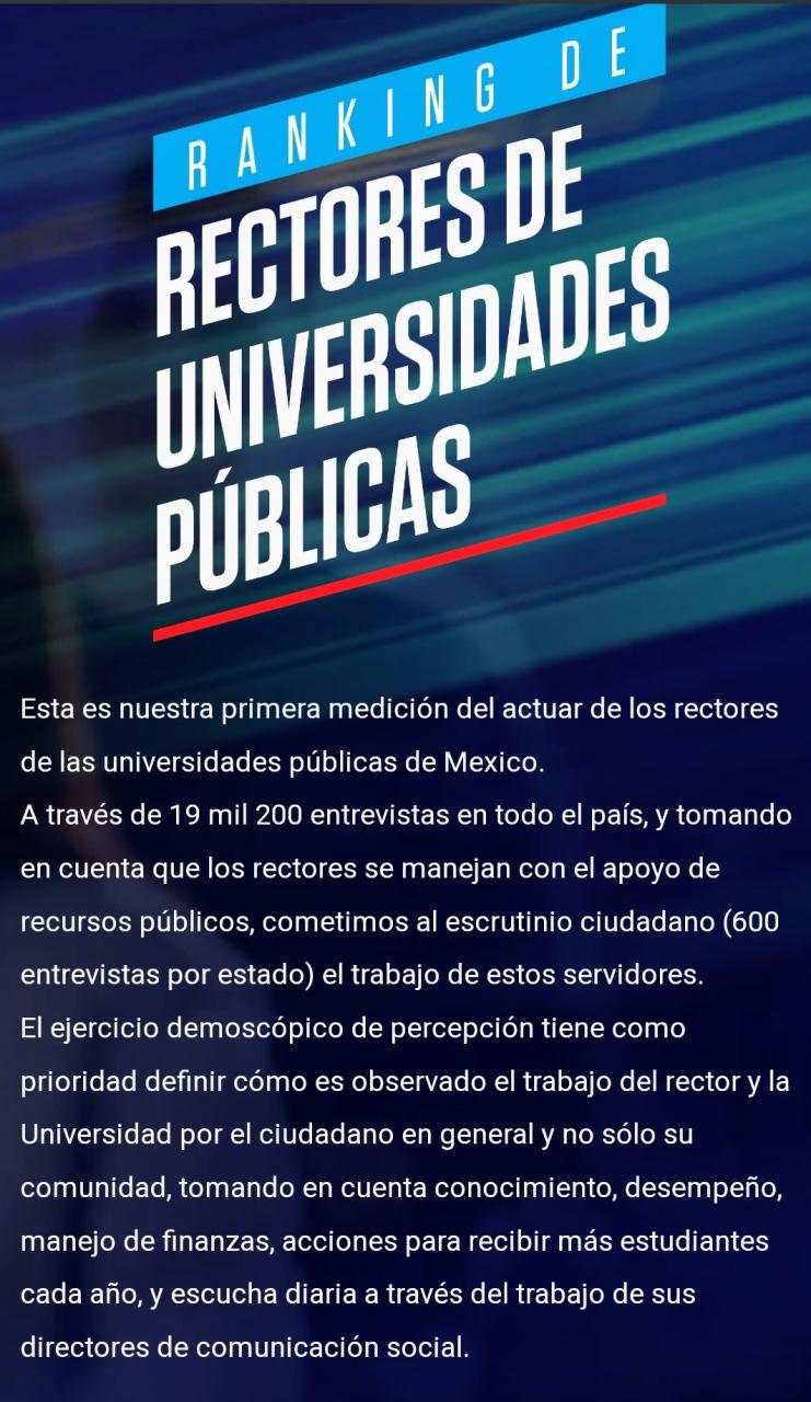 En la introducción, respecto del tema, la empresa bautizó el mencionado proyecto, con el nombre "RANKING DE RECTORES DE UNIVERSIDADES PÚBLICAS", mencionando que: "Esta es nuestra primera medición del actuar de los rectores de las universidades públicas de Mexico. A través de 19 mil 200 entrevistas en todo el país, y tomando en cuenta que los rectores se manejan con el apoyo de recursos públicos, sometimos al escrutinio ciudadano (600 entrevistas por estado) el trabajo de estos servidores.