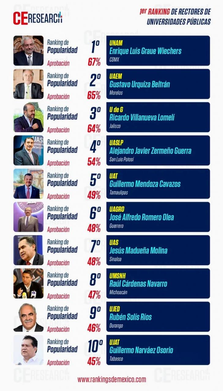 La empresa calificadora y encuestadora "RANKINGS DE MÉXICO" https://rankingsdemexico.com/, levantó por primera vez en su experiencia de empresa medidora de la opinión pública, una amplia encuesta en el mes de octubre, para medir la "popularidad" de los 100 mejores Rectores de universidades públicas mexicanas.