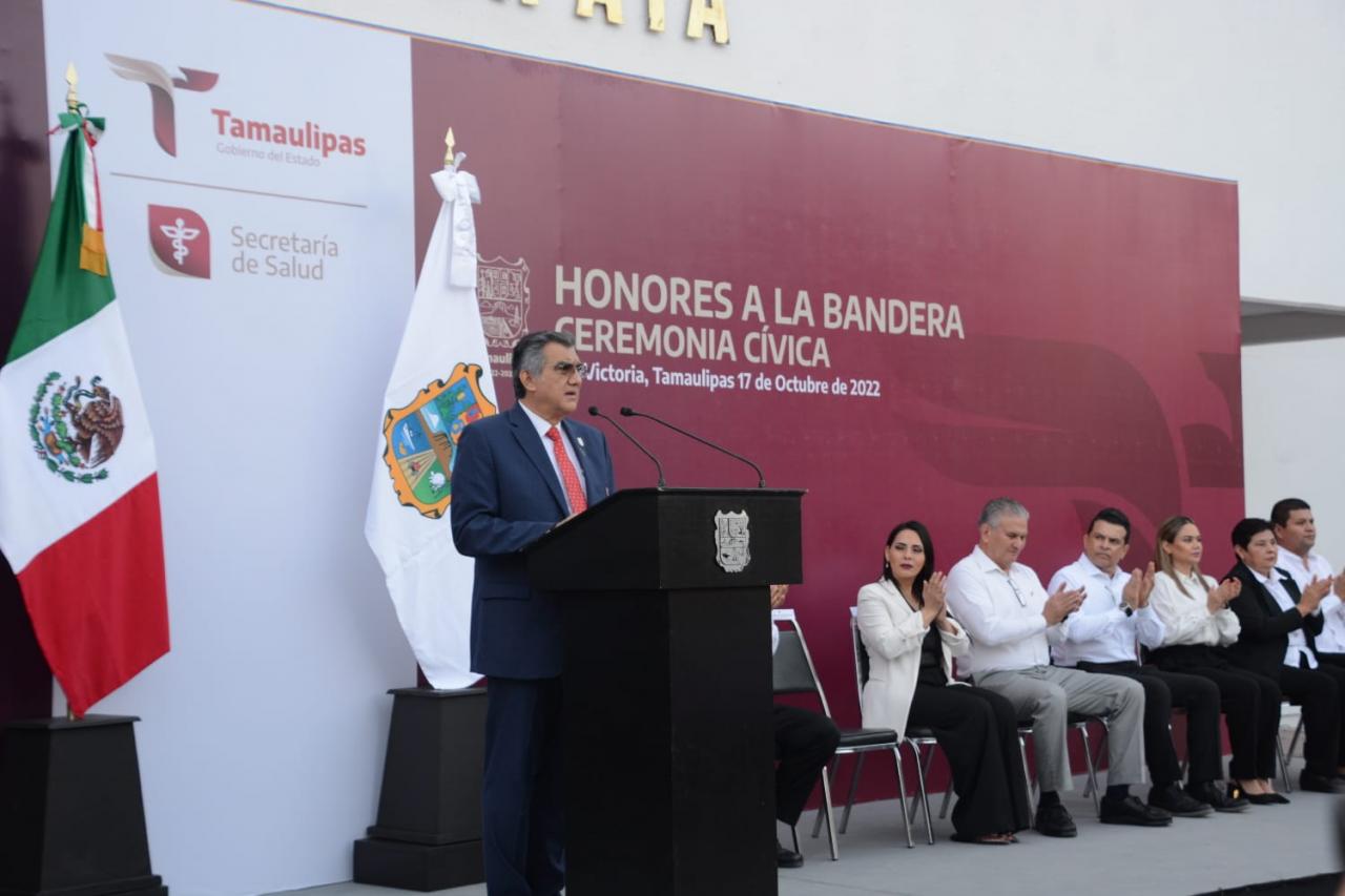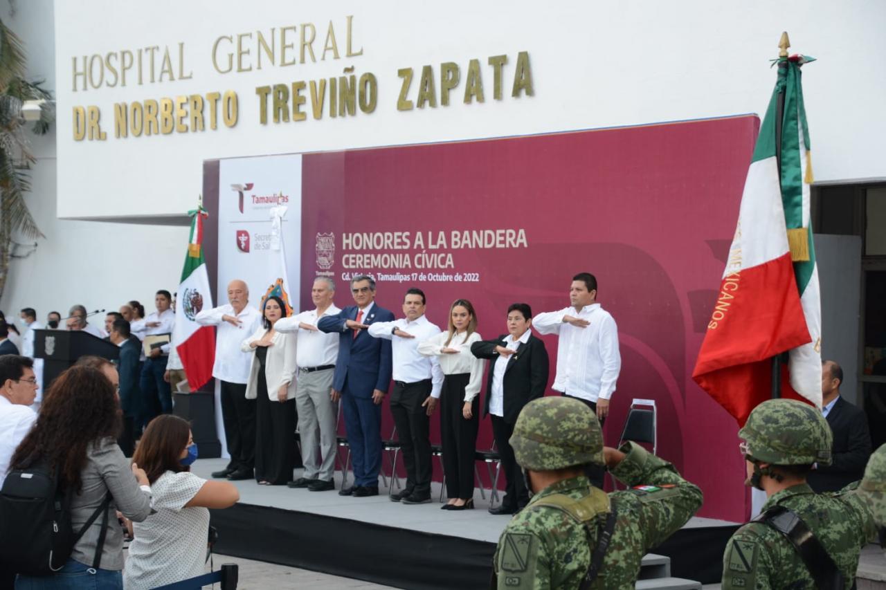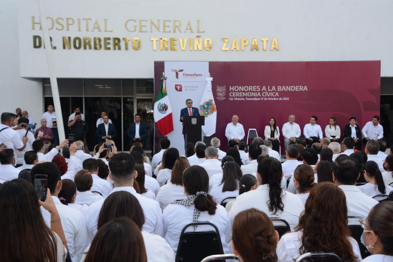 Al encabezar los honores a la bandera en la explanada del Hospital General "Norberto Treviño Zapata", el Gobernador pidió al personal de Salud de toda la entidad "asumir como propio, el dolor ajeno para recuperar el sentido verdadero y original de nuestra salud pública. En esta Cuarta Transformación, hemos trabajado para convertirla en un derecho humano, que debe ser universal en todo Tamaulipas y en todo México", dijo al recordar el ejemplo humanista del doctor Norberto Treviño Zapata.
