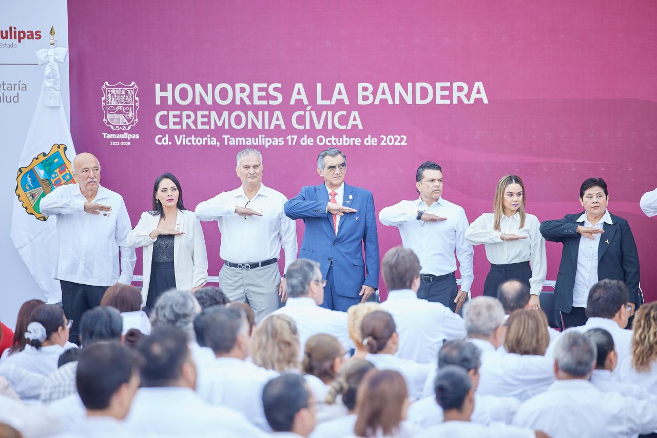 Luego de rendir honores a la bandera de México, así como al escudo de Tamaulipas, cuya escolta estuvo integrada por enfermeras del Hospital General, además del juramento a la bandera a cargo del doctor Luis Cobos, en esta ceremonia, se resaltó la importancia de los valores cívicos.