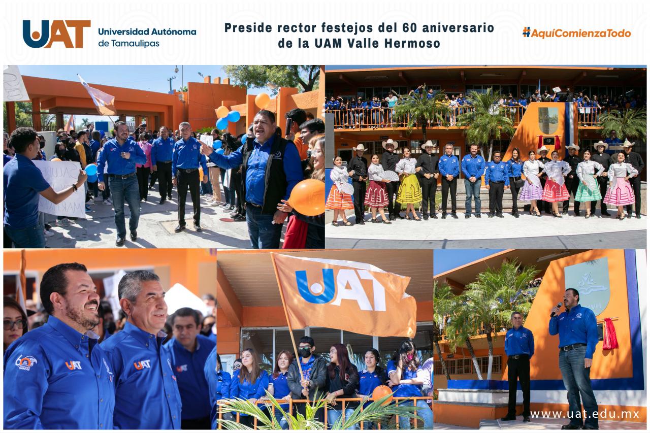 Al presidir los festejos por el 60 aniversario de la fundación de la Unidad Académica Multidisciplinaria Valle Hermoso (UAMVH), el C. P. Guillermo Mendoza Cavazos, rector de la Universidad Autónoma de Tamaulipas (UAT), destacó su reconocimiento al plantel que a lo largo de su historia ha sido un referente de la educación media superior y superior en esta región fronteriza de la entidad.